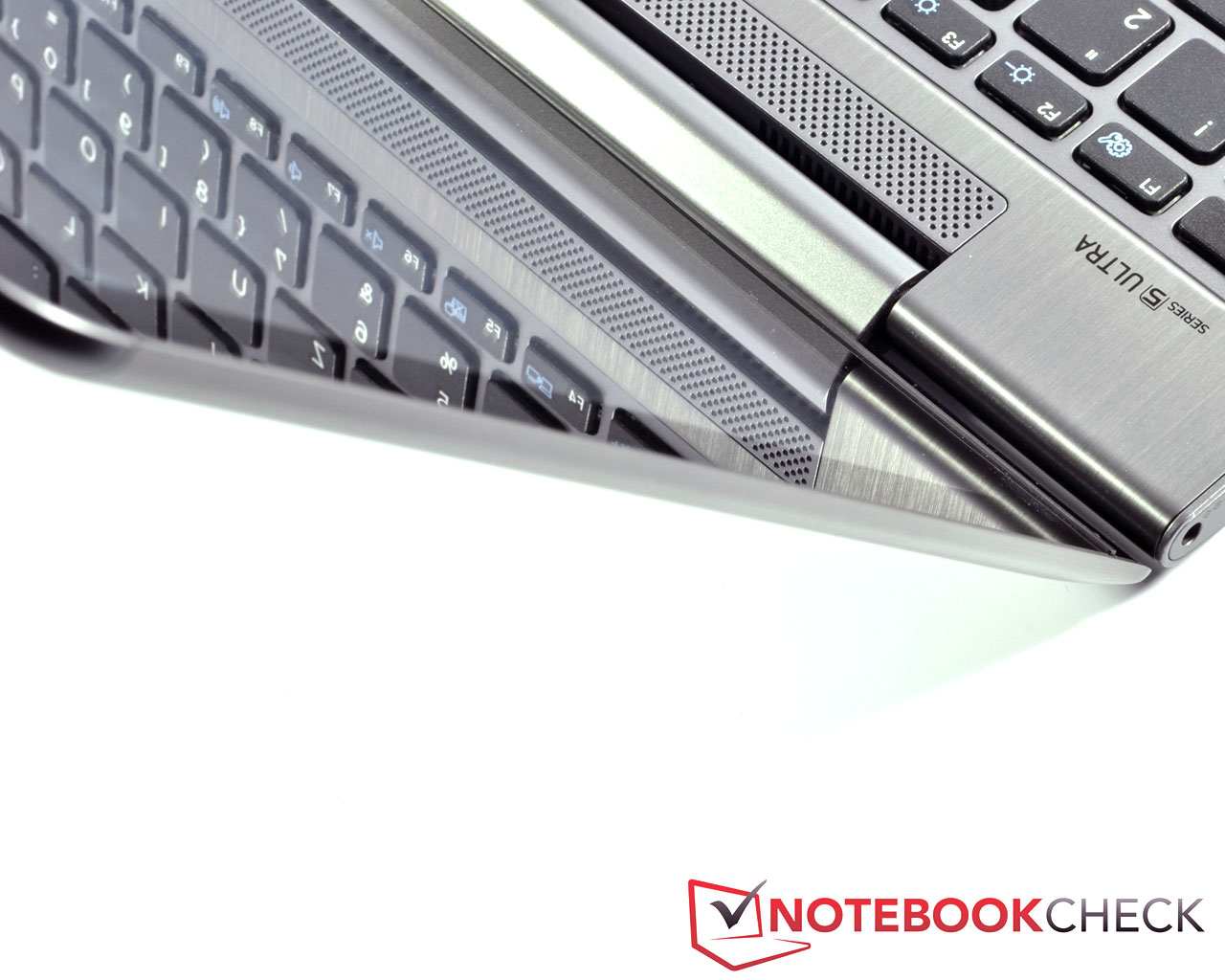 Die beiden Stereolautsprecher des Samsung Serie 5 540U3C werden an der Unterseite des Notebooks verbaut und strahlen nach unten ab, um über Reflexionen den Sound zum Hörer zu transportieren. Nutzt man das Notebook auf dem Schoß, werden die Schallwandler verdeckt und die Tonwiedergabe leidet stark.
