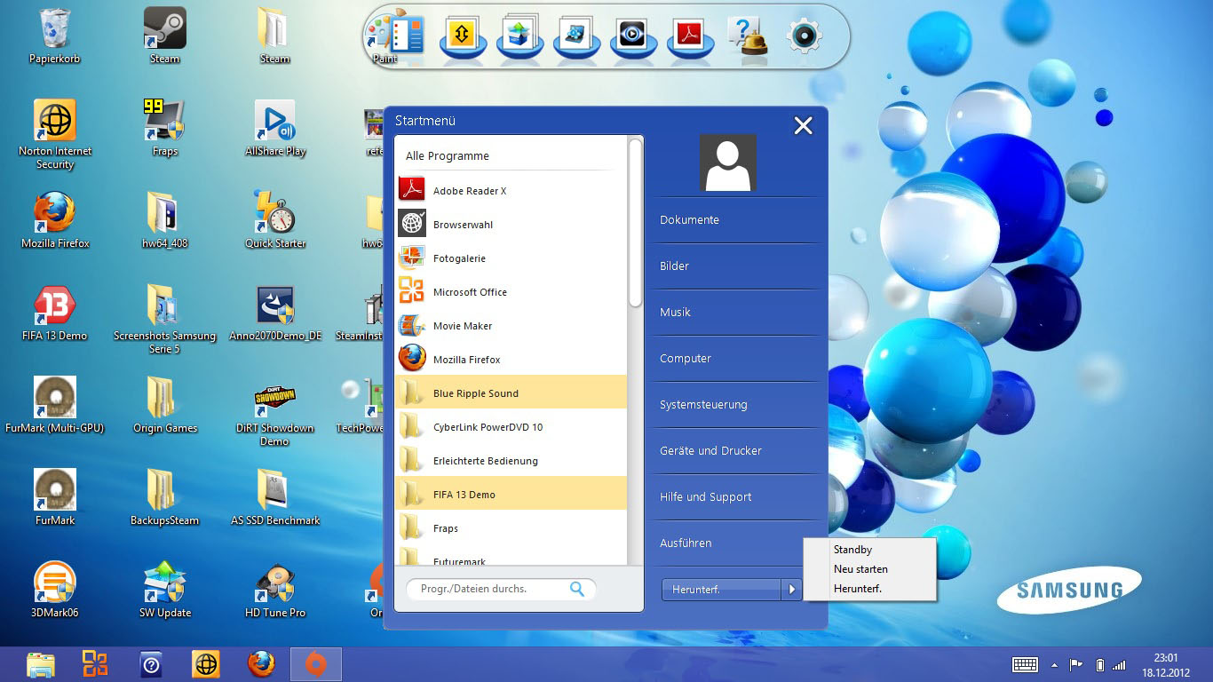 Außerdem sind verschiedene Samsung eigene Programme vorinstalliert, beispielsweise Quick Starter. Das bringt neben einem Recovery-Programm und Norton Online Backup auch das von früheren Windows Versionen bekannte Startmenü in ähnlicher Form zurück, das bei Windows 8 fehlt.
