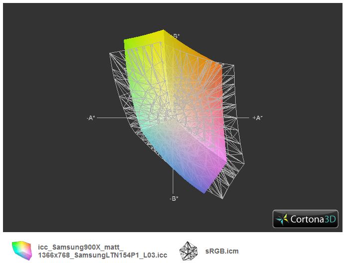 Das als Samsung LTN154P1-L03 auslesbare Panel fährt einen hohen Kontrast von 630:1 auf. In der Praxis sorgt das für knackige, leuchtende Farben. Der Farbraum, für den wir ein ICC-Profil erstellt haben, ist dennoch kleiner als sRGB. Die folgenden ICC-Grafiken zeigen das 900X3A (farbig) im Vergleich zu dem in der Bildverarbeitung üblichen sRGB- und AdobeRGB. An das gute Consumer Panel im Vaio EB4X und an das Profi-Panel im Vaio Z13Z9E kommt das Samsung-TFT aber nicht heran.