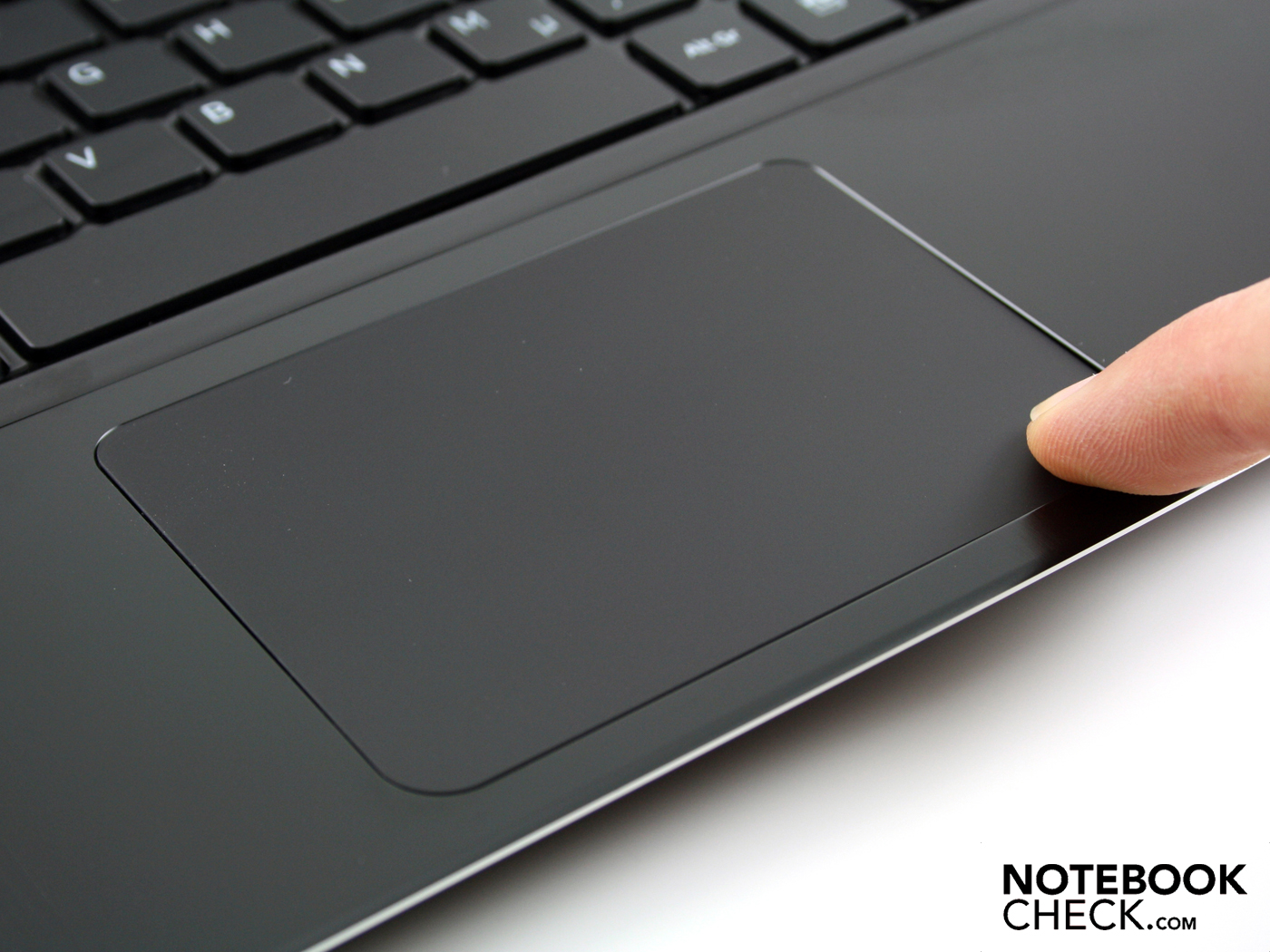 Das Multi-Touch-Pad vom Typ Synaptics ClickPad V8.0 ist sehr groß und matt (keine Fingerabrücke, gute Gleiteigenschaften). Seine Spezialität ist eine „linke Maustasten“ unter dem kompletten Bereich der Oberfläche. Wie bei den Apple MacBooks geht die Pad-Fläche einen Millimeter nach unten und erzeugt damit einen Mausklick. Das Anheben und Antippen mit dem Finger ist weiterhin möglich aber nicht mehr erforderlich.
