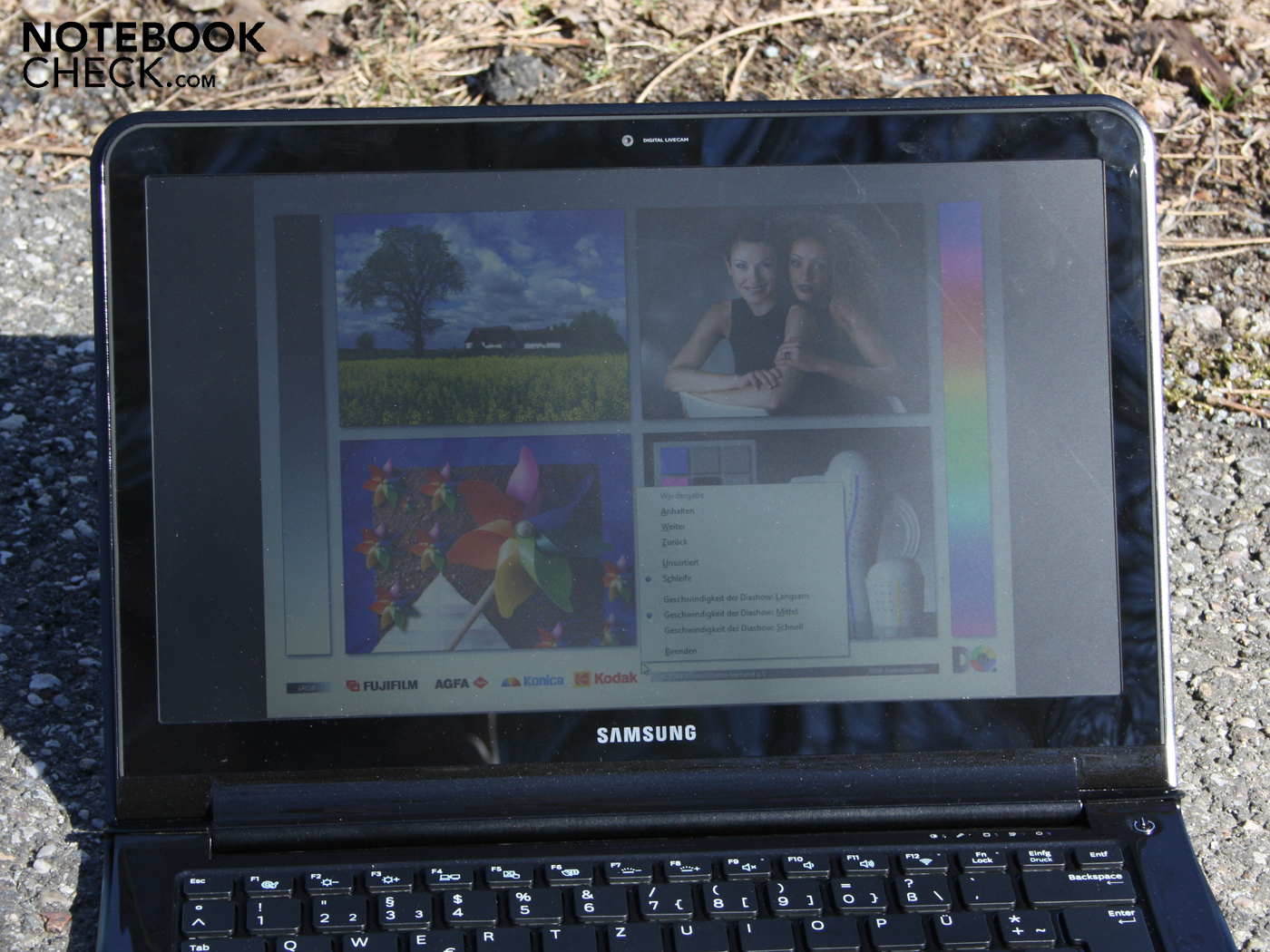 Den Einsatz im prallen Sonnenlicht konnten wir an einem sonnigen Wintertag ausprobieren. Dabei konnten wir die Entspiegelung des Panels gut im Bilde festhalten. Die Reflexionen des Umgebungslichts sind fast komplett verschwunden. Die im Akkubetrieb gedrosselte aber immer noch starke Luminanz von 338 cd/m² (Mitte) genügt, um das Bild in fast jedem Winkel deutlich zu zeigen. Hier gibt es nicht mehr zu sagen als: Das perfekte TFT für draußen.
