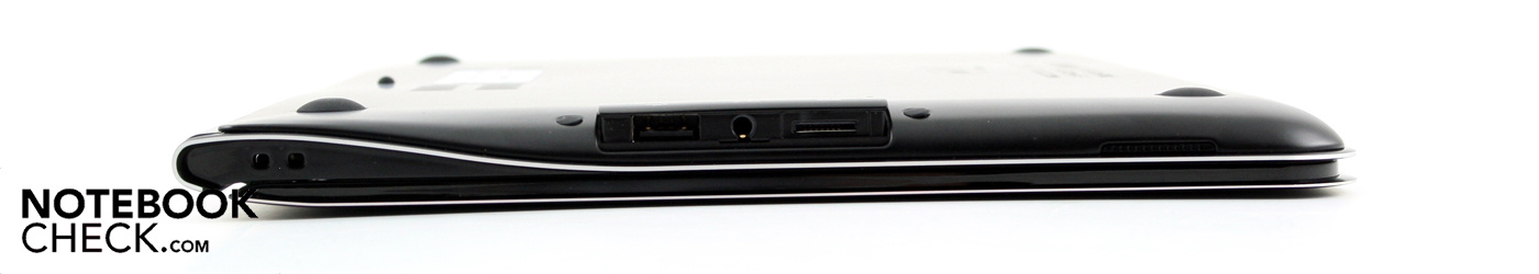 Wo sind die Lautsprecher? Es gibt in der Tat zwei davon, rechts und links der Handauflage befinden sich zwei winzige Öffnungen. Die Stereo-Lautsprecher liefern ein stark höhenlastiges Klangbild. Das Hören der Lieblingsmusik macht mit dem 900X3A folglich keine Freude. Die Lautstärke fällt ebenfalls nicht besonders hoch aus. Der seitlich angeordneten Audio Ausgang (Kombination mit Mikrofon) funktionierte an zwei Yamaha Boxen (YST-M20SDP) einwandfrei und ohne Rauschen.