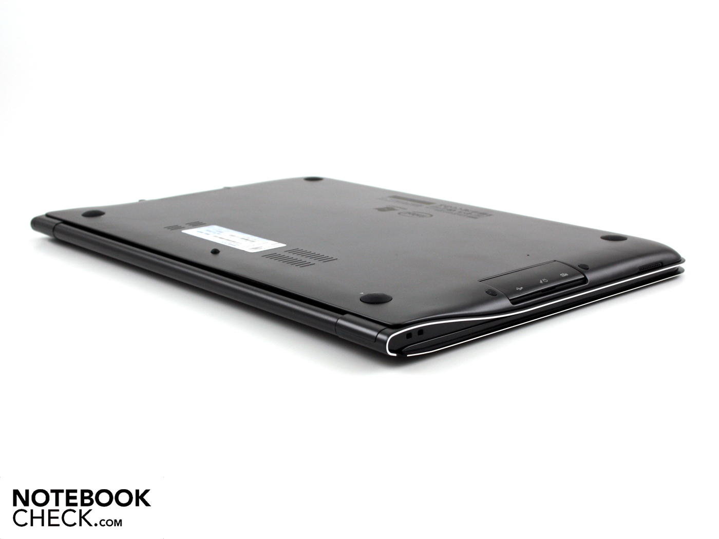 Steigen wir gleich in medias res. Der schwarze 13.3-Zoller aus leichtem und robustem Duraluminium wirkt wie aus einem Guss gebaut. Das liegt daran, dass Handauflage, Deckel und Bodenwanne aus homogen aus demselben lackierten Aluminium bestehen. Außer zwei Luftöffnungen gibt es auf der Unterseite keine Öffnungen oder Wartungsklappen. Es versteht sich von selbst, dass bei einem solchen Premium-Subnotebook der Akku „unsichtbar“ im Gehäuse verstaut wird.