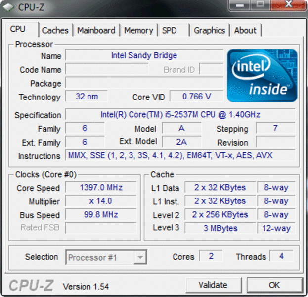 Der Intel Core i5-2537M (2 x 1.4 GHz) ist eine Ultra Low Voltage CPU mit einem niedrigen TDP (maximale thermische Verlustleitung) von 17 Watt. Die Taktung ist per Turbo-Boost 2.0 variabel, sie kann bis zu 2.3 GHz betragen (2 GHz bei Belastung beider Kerne). Das System basiert auf einem Intel HM65 Cougar Point Chipsatz (Cougar Point 2.0, B3 Stepping).