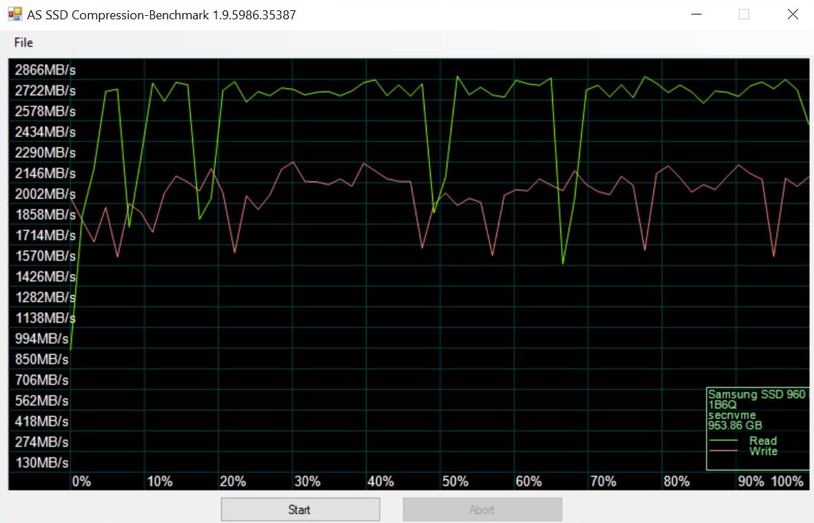 Beim Umgang mit komprimierbaren Daten liegen beide 960-er auf einem guten Niveau, wobei die 960 Pro ein etwas besseres Ergebnis beim Schreiben erzielt, was aber zu erwarten war. Die Samsung SM951 schwächelt beim Schreiben im Vergleich zu den beiden Testkandidaten. Beim Lesen komprimierter Daten ist auffällig, dass die 960 Evo konstanter arbeitet als die 960 Pro. Mehrmalige Versuche mit dem Testsystem ergaben immer das dargestellte Ergebnis.