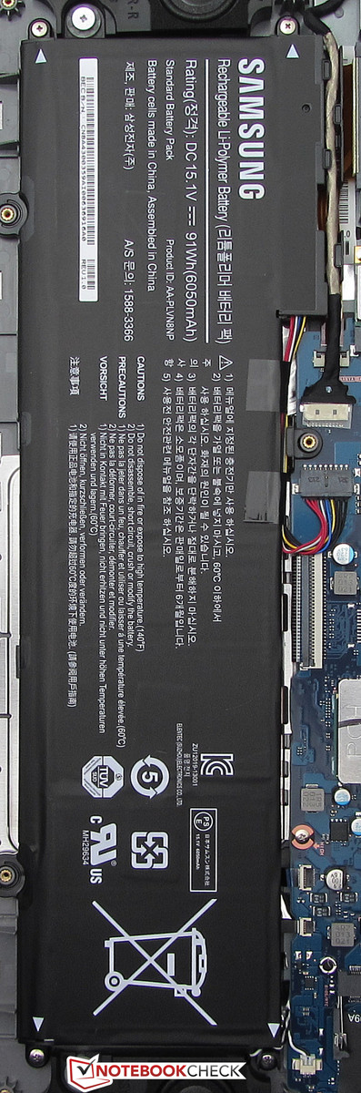Nach Entfernung der Unterschale ist der Zugang zum Arbeitsspeicher, zur Festplatte, zur BIOS-Batterie, zum WLAN-Modul und zu den Lüftern gegeben. Beide Lüfter könnten zwecks Reinigung ausgebaut werden. Das Ativ Book ist mit einer Arbeitsspeicherbank ausgestattet, die noch unbelegt ist. Samsung hat 8 GB Arbeitsspeicher direkt auf die Hauptplatine gelötet. Der Arbeitsspeicher arbeitet im Single-Channel-Modus. Ein Tausch der Festplatte würde kein Problem darstellen. Es passen Festplatten mit Bauhöhen von 7 und 9,5 mm in den Rechner. Sollte der Akku einmal den Geist aufgeben, könnte er ersetzt werden. Er wird von vier Schrauben gehalten und ist über einen Stecker mit der Hauptplatine verbunden.