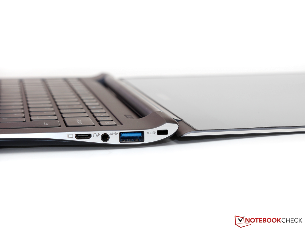 Ultrabooks sind typischerweise nicht gerade für ihre überwältigende Anschlussvielfalt bekannt, was bei einem mobilen (Zweit-) Gerät aber meist zu verschmerzen ist. Der Käufer des ATIV Book 9 darf sich über immerhin zwei USB-Ports freuen, die beide dem aktuellen USB-3.0-Standard entsprechen. Hinzu kommen ein Micro-HDMI- (bis maximal 4.096 x 2.160 Pixel) sowie ein VGA-Ausgang, wobei letzterer nur mittels eines zusätzlichen, nicht beiliegenden Adapters genutzt werden kann. Im Lieferumfang enthalten ist dagegen ein passendes Dongle für den ebenfalls im Mini-Format ausgeführten LAN-Port.