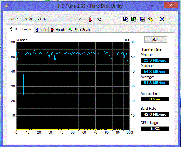 Schneller Speicher? Das wollen wir genauer wissen. HD-Tune und Crystal Disk Mark verpassen mit 52 bzw. 80 MB/s jedoch die Normalform aktueller SSD-Speicher deutlich. Wir haben zum Vergleich Slate- und Convertible-PCs aufgereiht. Die gute Zugriffsgeschwindigkeit kommt durch den brauchbaren 4K-Durchsatz zustande. 7 MB/s sind zwar nicht perfekt, aber deutlich schneller als die ~ 0,4 MB/s einer konventionellen HDD.