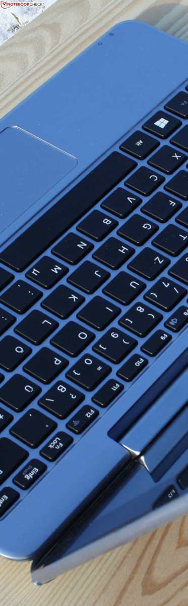Die Keyboard-Base passt nicht zum stabilen Eindruck des Tablet-Bodys. Sie kann relativ einfach verzogen werden und es ist erkennbar, wie das Metallgelenk beim Öffnen an der Kunststoff-Base der Tasten zerrt.