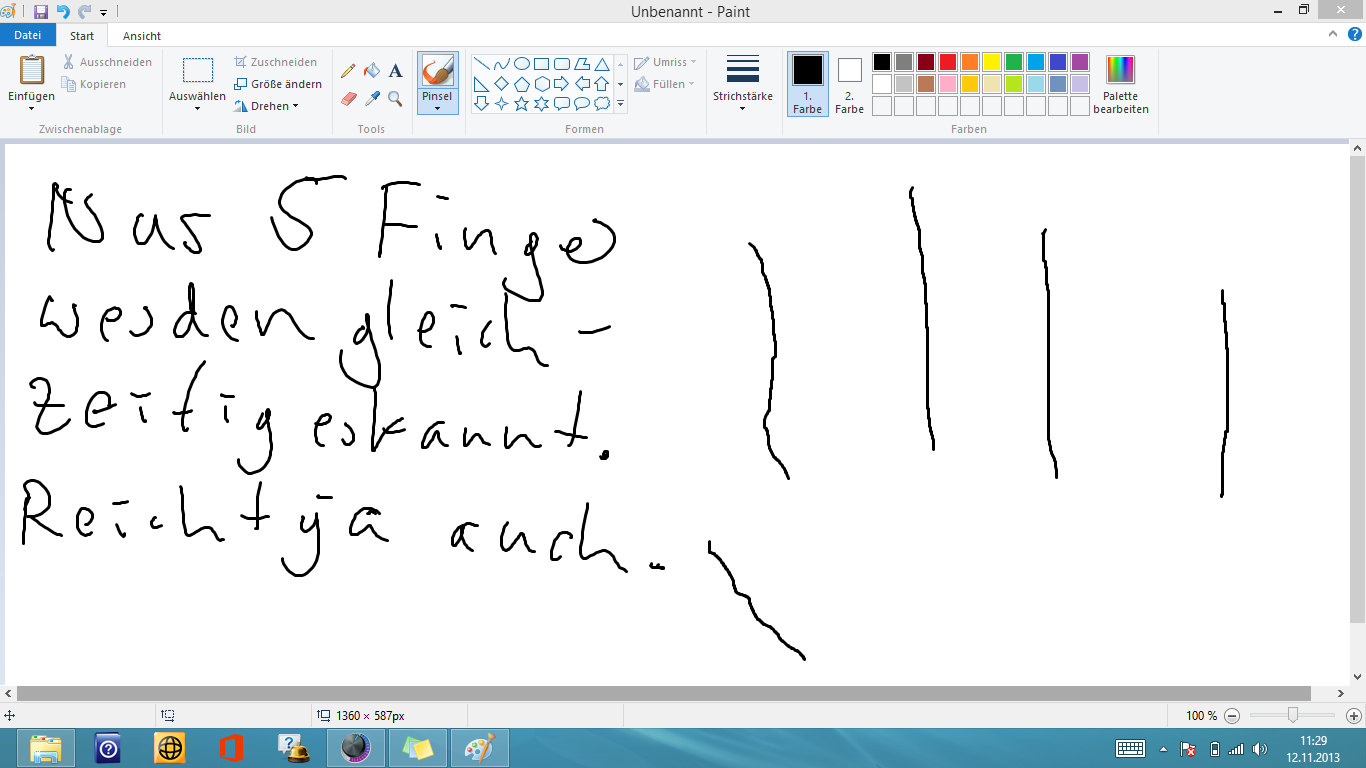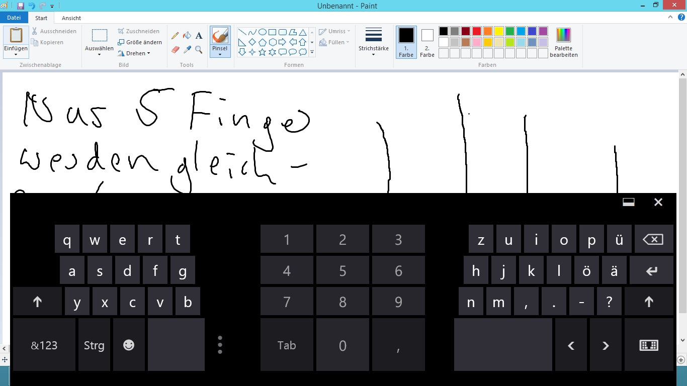 Eines müssen wir Samsung lassen: Die Bedienung des Tablets per Finger oder Stift (S-Pen) ist erstklassig. Da stört es auch gar nicht, dass wir es mit einem 5-Finger-Multitouch zu tun haben (üblich sind 10-Finger). Wer zeichnet oder schreibt denn auch mit mehr als fünf Fingern gleichzeitig. Die Handschrift wurde als Tastatur-Ersatz als auch in Paint perfekt erkannt und mit unmerklicher Verzögerung niedergeschrieben. Die virtuelle Tastatur kann Windows 8 typisch zweigeteilt werden, wobei dann die zwei Daumen schreiben.