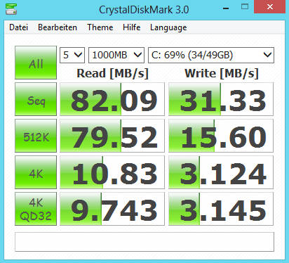 Beeindruckend zeigt sich in diesem Vergleich, der am unteren Ende der allgemeinen SSD-Performance-Skala angesiedelt ist, die Intel SSD 525 Series des Aspire P3-171. 12 x so schnell wie der Speicher des ATIV Tab 3, das meldet der Write 4K-Test. Acers Tablet liegt damit auch im System Storage deutlich vorn.