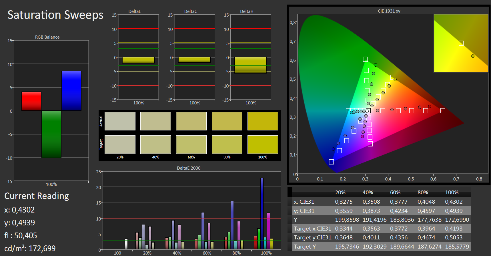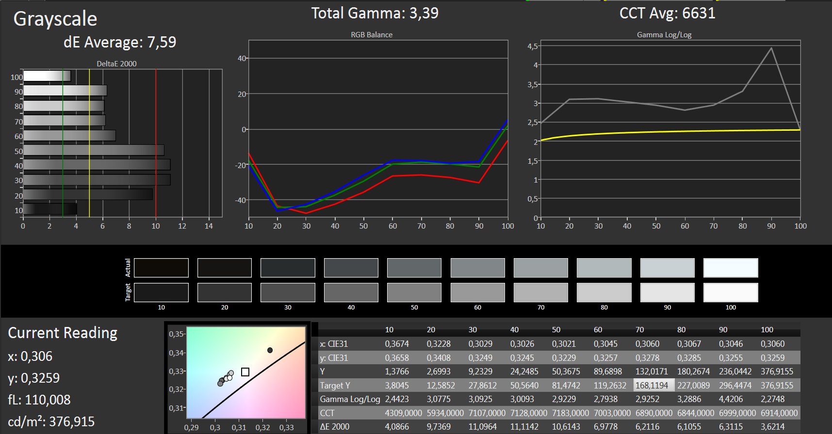 Die Kalibrierung verweigerte auf Grund einer Treiberinkompatibilität den Dienst (Kalibrierung scheitert, GMA-Treiber unterstützt keine einstellbaren Gamma-Kurven, sog. Video LUTs). Folglich können wir hier keinen Farbraumvergleich anbieten. Via externen PC haben wir CalMAN das Panel mit dem Fotospektrometer vermessen lassen. Die Abweichung bei den Graustufen (DeltaE 4-10) ist relativ stark, dennoch besitzt die Anzeige keinen Blaustich wie oftmals TN-Anzeigen. Magenta schiebt zwar in den blauen Bereich, dafür geht Grün in Richtung Gelb (Saturation). In Summe ergibt das einen eher warmen Bildeindruck, den uns die Messung mit einem Weißwert (CCT) von 6.631 bestätigt.