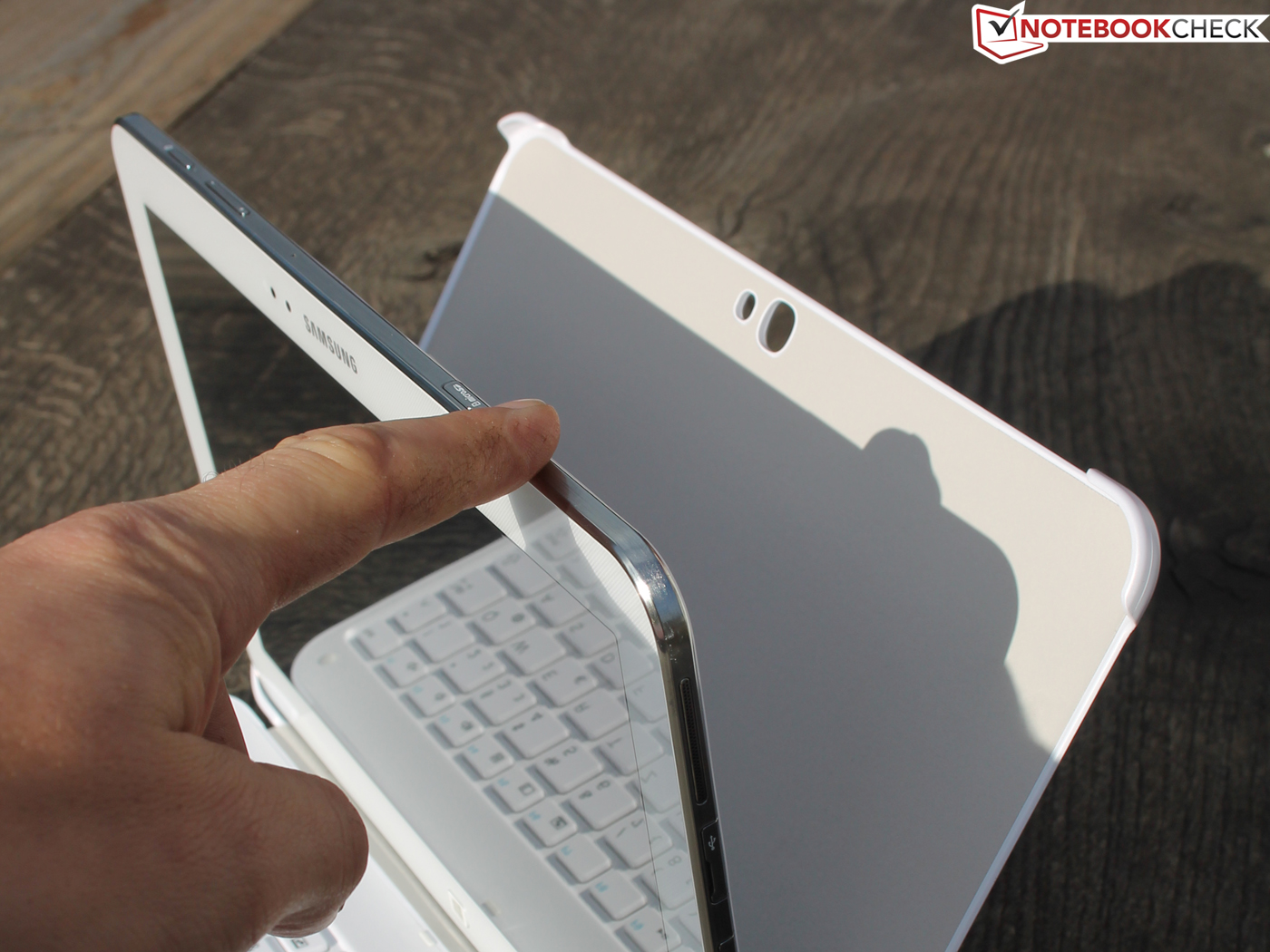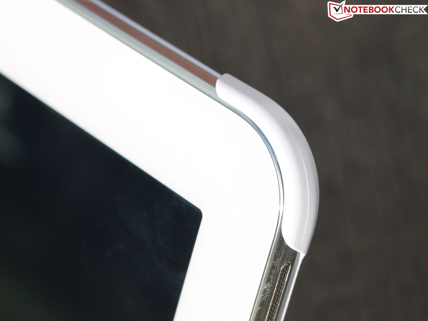 Das 10-Zoll-Tablet besteht aus Kunststoff, die metallisch wirkende silberne Randleiste ebenso. Einen Preis in Sachen Stabilität gewinnt das ATIV Tab 3 nicht, Verwinde-Versuche mit beiden Händen erzeugen ein deutliches Knarren in der Konstruktion. Das Tablet wurde sauber gefertigt, alle Spaltmaße sind in Ordnung. Die weiße Oberfläche kaschiert Fingerabdrücke vortrefflich, die glatte Rückseite wurde zudem mit kleinen Punkten versehen. Die sorgen aber nicht für eine bessere Griffigkeit, sondern sind lediglich optischer Natur (gegen Fingerabdrücke). Die Rückseite ist folglich glatt und das ATIV Tab 3 könnte leicht aus den Händen rutschen.