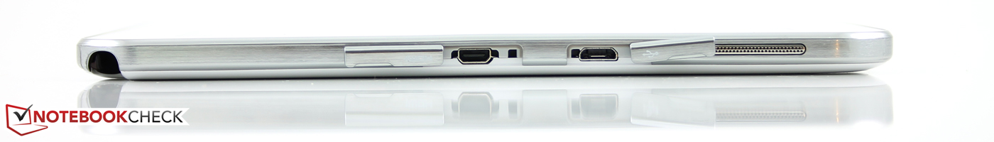 Stiefmütterlich hat Samsung das Thema Anschlüsse abgehandelt. Lediglich ein einzelner Micro-USB 2.0 dient der Peripherie. Wer schnell einen USB-Stick anstecken möchte, der muss sich einen Adapter und ggf. einen USB-Hub beschaffen. In dieser Preislage hätte selbiger gern im Karton liegen dürfen. Beim IdeaTab Miix 10 sieht die Sache noch schlechter aus: Hier wird der einzige Micro-USB-Port durch die Tastatur-Dock genutzt und für Geräte versperrt. Lenovos ThinkPad Tablet 2 hat, ebenso wie das Aspire P3-171 (USB 3.0!), einen großen USB-Port.