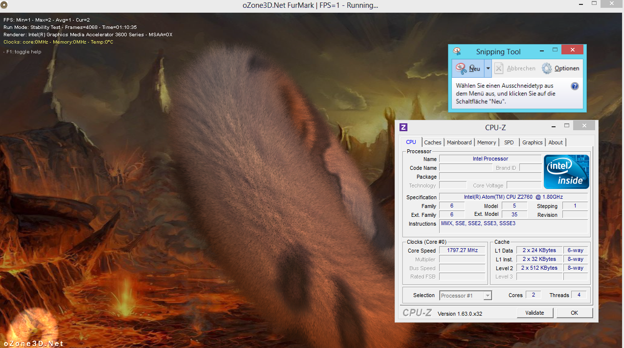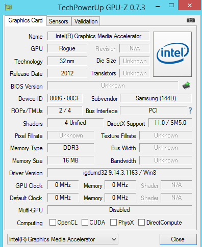 Die PowerVR SGX545 (IGP), oder auch schlicht Intel GMA 3650, stellt sich im Vergleich zu Intel iGPUs oder AMD APUs ganz weit hinten an. Die integrierte HD Graphics des Aspire P3-171 zeigt sich sechsmal so schnell, die Radeon HD 6250 der Z-60 APU doppelt so schnell. Zur Gesamteinschätzung haben wir den Pentium 967 eingeblendet (HD Graphics), der etwa im Acer Aspire V5-531 eingebaut ist (fast 3 x so schnell).