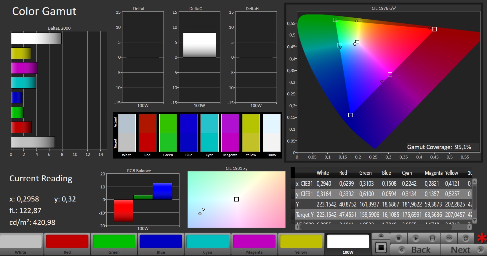 In unseren Tests mit dem Spektralfotometer und der Software CalMAN zeigen sowohl Graustufen als auch Farben einen deutlichen Blaustich und somit mit bloßem Auge sichtbare Abweichungen vom Optimalwert. Allerdings bleiben diese insgesamt im Rahmen.