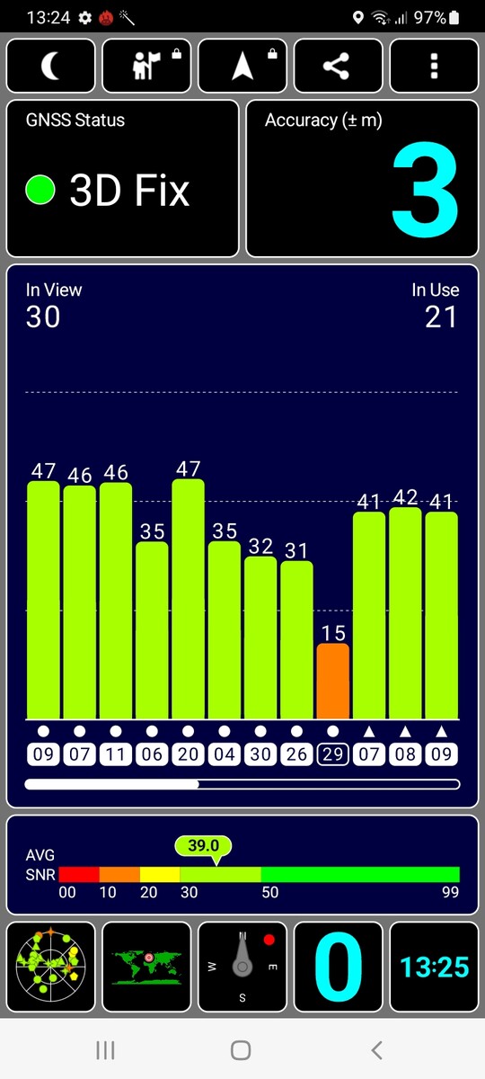 Tritt man ins Freie, so dauert es einen Moment, bis das Galaxy A04s genug Satelliten erkennt, um uns auf 3 Meter genau zu orten. Die Anzahl an gefunden Satelliten ist eher gering.