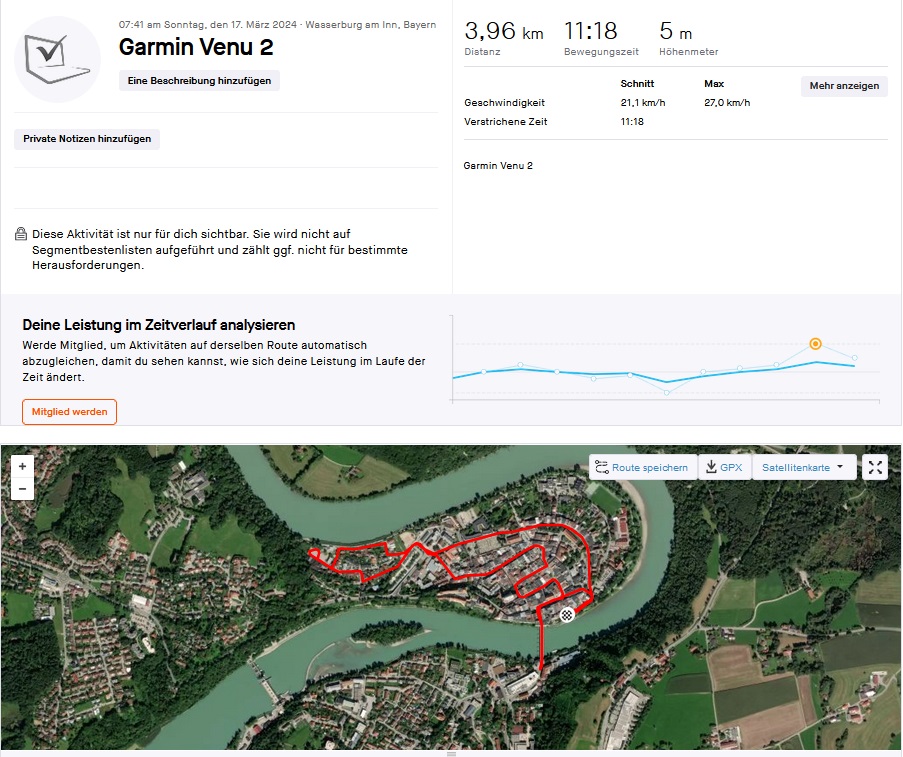 Wir wollen nun aber genau wissen, wie sich das Handy bei der Ortung in der Praxis schlägt, also wie gut es beispielsweise als Navigationsgerät fürs Fahrrad funktioniert. Dafür fahren wir eine Runde und nehmen die Smartwatch Garmin Venu 2 mit, welche für ihre hohe Genauigkeit bekannt ist.