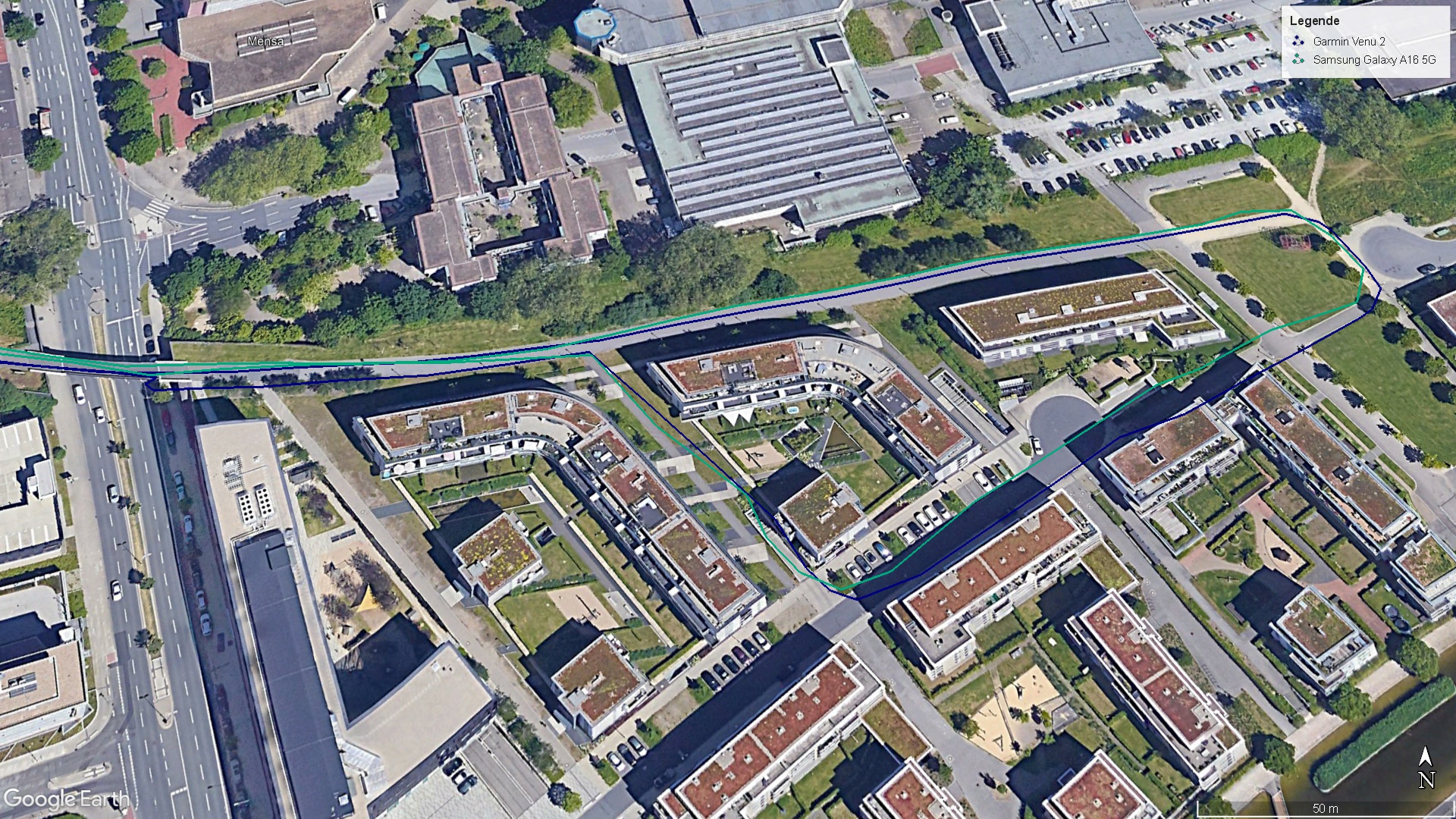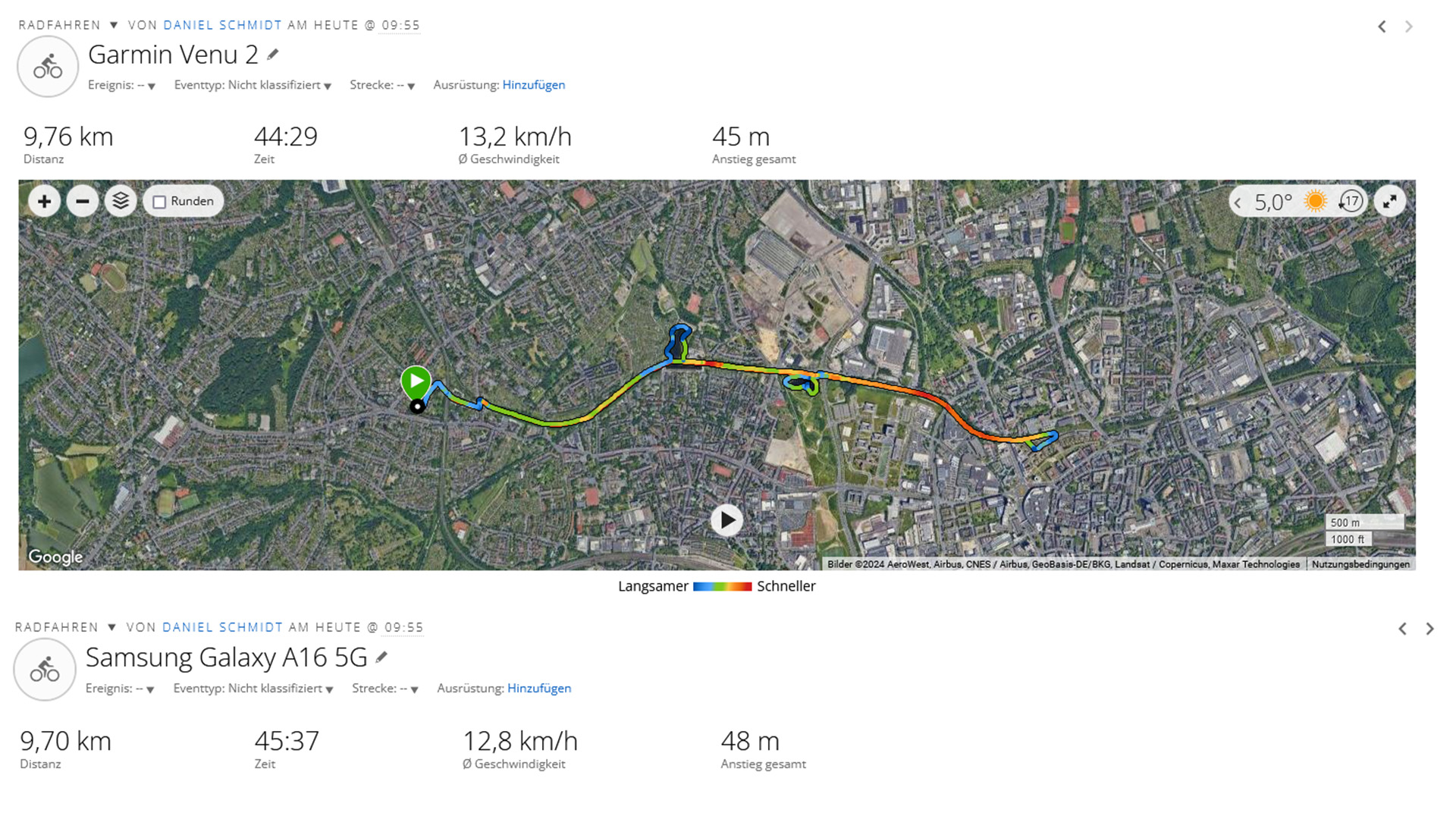 Mit GPS, Glonass, Beidou, Galileo und QZSS nutzt das Samsung Galaxy A16 5G alle großen Satellitennetzwerke zur Positionsbestimmung. Im Freien ist sie bis auf 3 Meter genau, wenn wir mit dem Smartphone in der Hand dastehen. Wie hoch die Genauigkeit in Bewegung ist, ermitteln wir auf einer kleinen Fahrradrunde, auf der zum Vergleich die Fitness-Smartwatch Garmin Venu 2 mitfährt. Das Samsung Galaxy A16 5G schlägt sich in diesem Praxistest sehr gut, denn es leistet sich fast keine größeren Ungenauigkeiten. Für die Navigation lässt sich das Handy daher bedenkenlos einsetzen.