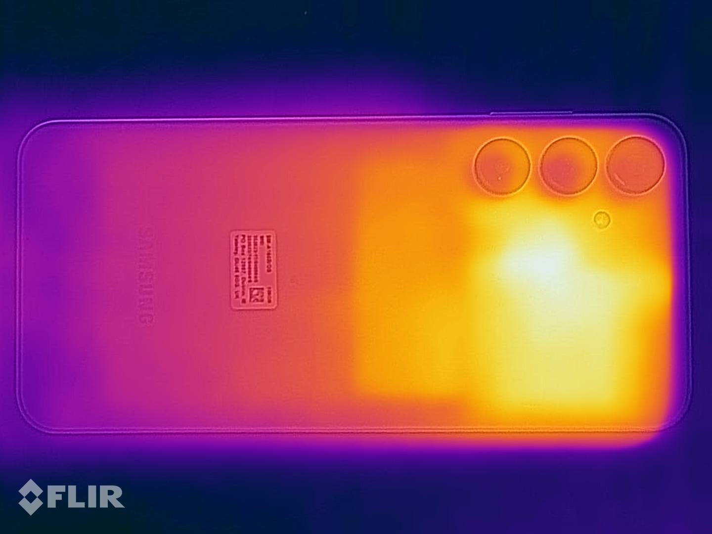 Durch die moderate Power des Samsung Exynos 1330 kommt es im Betrieb auch zu keinerlei Temperaturproblemen. Bei voller Auslastung erhitzt sich das Gehäuse zwar auf bis zu 45,5 °C, was sich schon recht warm anfühlt. Intern bleibt das Smartphone aber cool, denn es kann auch unter Dauerstress immer seine volle Leistung abrufen.