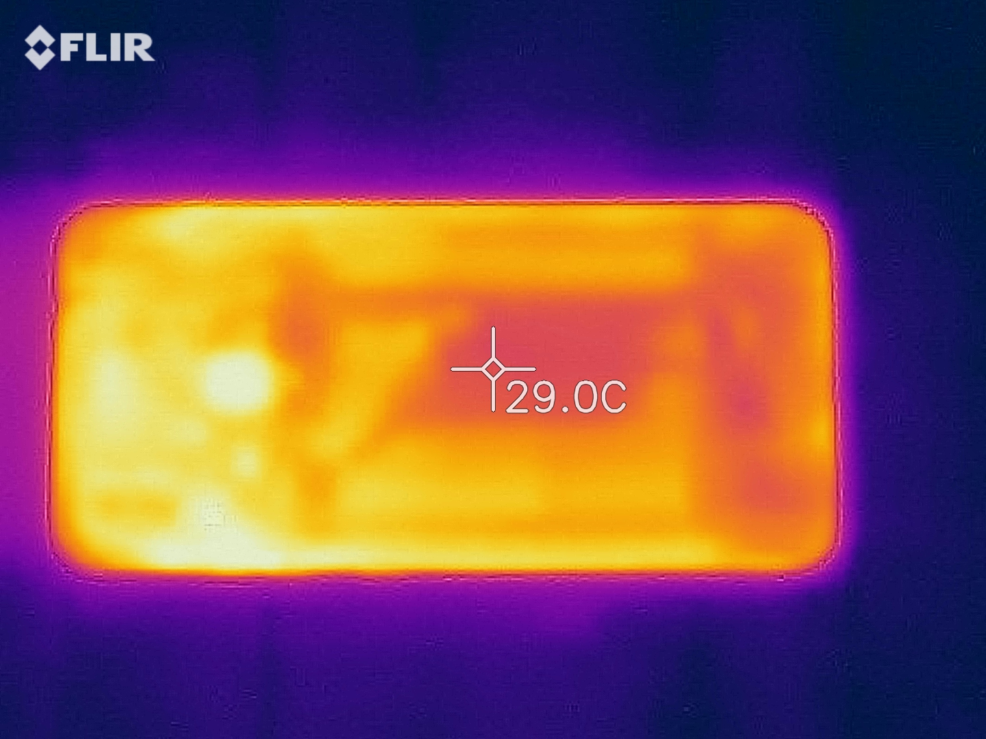 (+) Auf der Unterseite messen wir eine maximalen Wert von 34.3 °C (im Vergleich zum Durchschnitt von 34 °C).