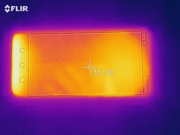 (+) Die maximale Temperatur auf der Oberseite ist 35.1 °C. Im Vergleich liegt der Klassendurchschnitt bei 35.2 °C (von 21.9 bis 247 °C für die Klasse Smartphone).