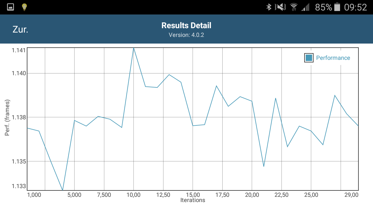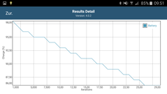Um zu überprüfen, ob diese erfreulich niedrigen Temperaturen nicht die Folge einer stetig zunehmenden Leistungsreduktion der verbauten Komponenten sind, nutzen wir den Akkutest des GFXBench. Dieser führt den T-Rex-Test dreißigmal hintereinander aus und protokolliert dabei die gebotene Leistung sowie den Batterieverbrauch. Erfreulicherweise liegt die Abweichung der Messergebnisse innerhalb eines Prozentpunkts, womit es zu keinerlei Throttling kam.