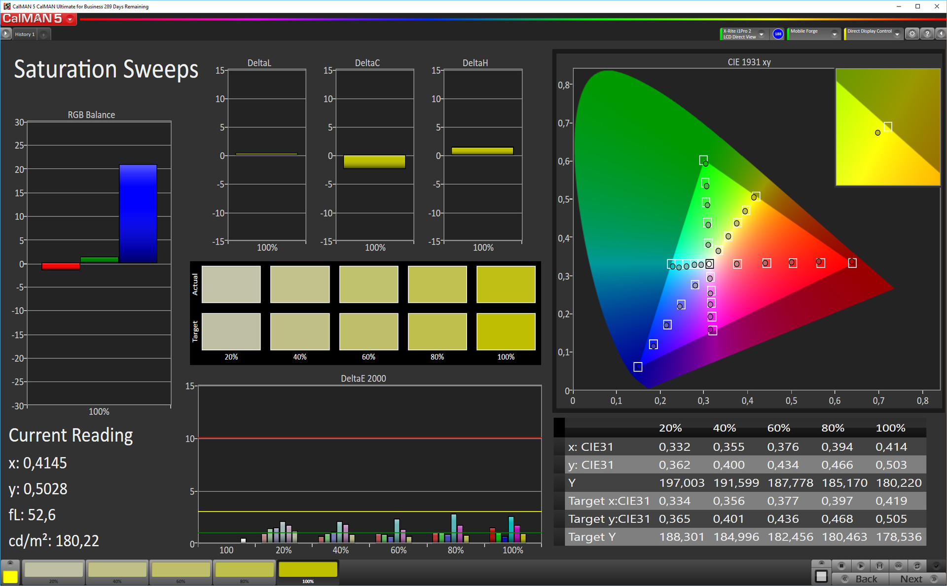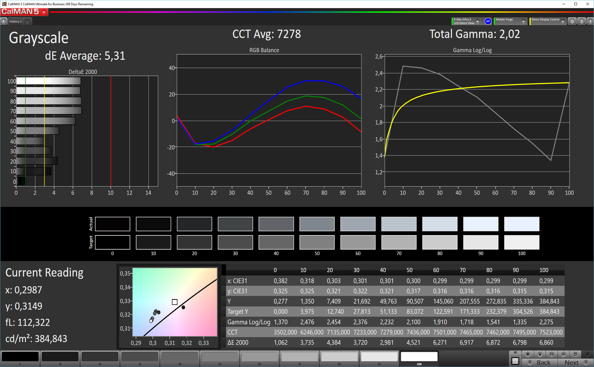 | Delta E Graustufen * | 1.34 | 2.68 -100% | 3.81 -184% | 8.24 -515% | 5.85 -337% | 7.53 -462% | 2.91 -117% |