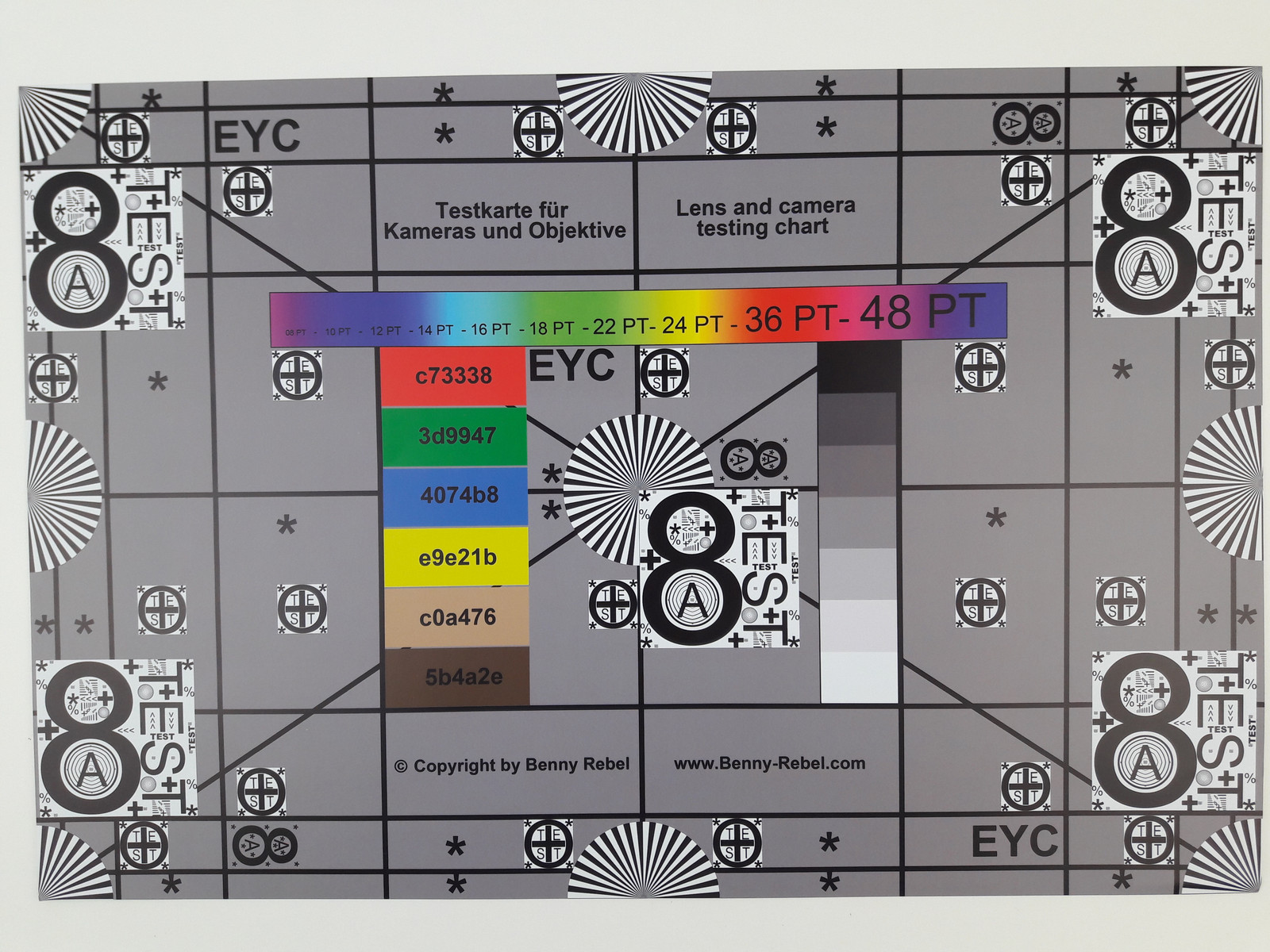 Zur Beurteilung der Bildschärfe fotografieren wir unter definiertem Kunstlicht unseren Testchart formatfüllend ab. Insbesondere im Bereich der linken oberen Ecke zeigt sich der schon in den Alltagsaufnahmen festgestellte Schärfeabfall erneut. In der Bildmitte ist die Darstellung hingegen sehr ordentlich, selbst das iPhone 6S zieht hier hinsichtlich der Auflösung den Kürzeren.