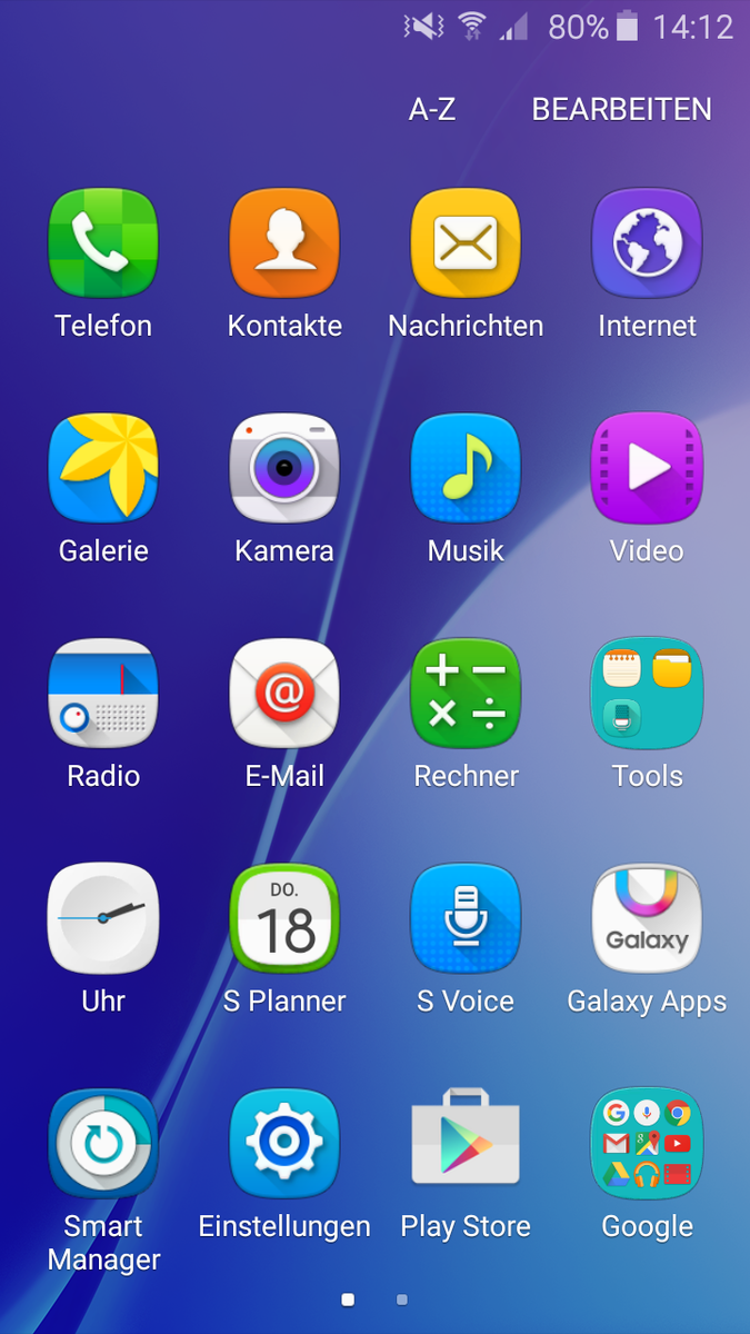 Samsung nimmt einige Veränderungen an der Benutzeroberfläche vor. So befindet sich beispielsweise standardmäßig links neben dem Homescreen eine News-Feed-Seite (Flipboard Briefing), die wahlweise ausgeblendet werden kann. Zudem steht ein Themes-Manager für die optische Anpassung des Betriebssystems zur Verfügung. Des Weiteren war bei unserem Testgerät serienmäßig die sogenannte Smart-Stay-Funktion aktiviert, bei der die Frontkamera das Gesicht des Nutzers erfasst und den Bildschirm so trotz eines eingestellten Timeouts nicht deaktiviert.
