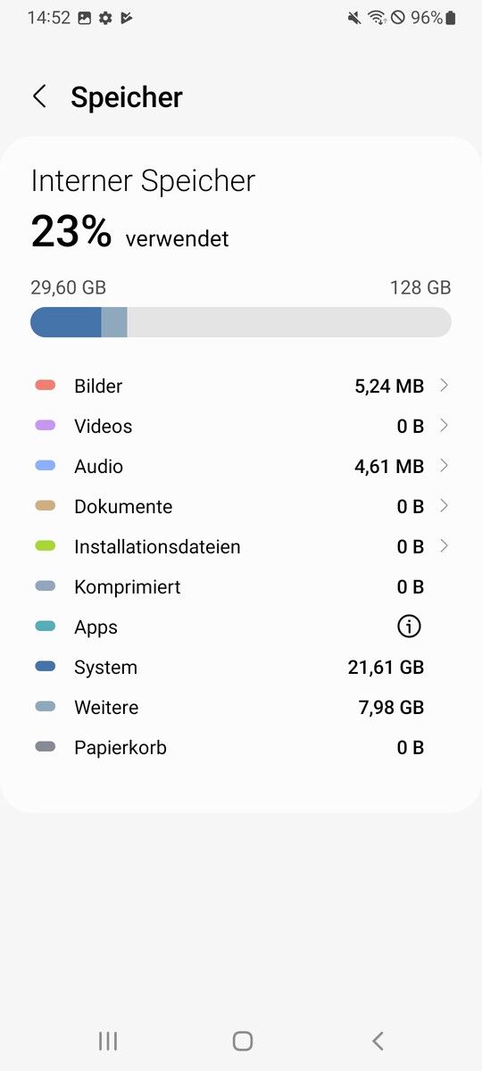 Samsung bietet das Galaxy A33 5G nur in einer Speicherausstattung an: Mit 6 GB RAM und 128 GB UFS-2.2-Speicher kostet es offiziell 369 Euro. Im werksfrischen beziehungsweise zurückgesetzten Zustand reduziert sich der freie Speicherplatz auf etwa 98 GB.