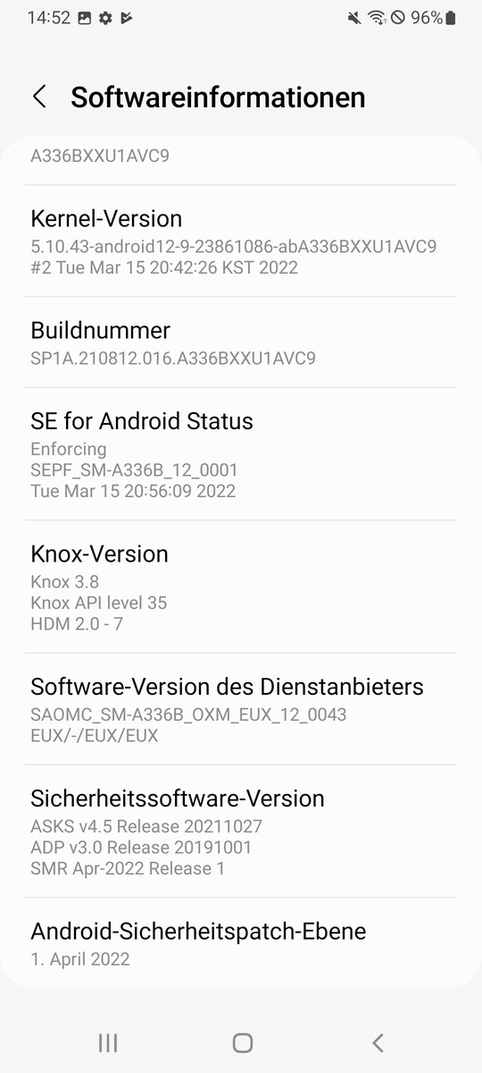 Samsung stattet das Galaxy A33 5G mit Android 12 und seiner hauseigenen Benutzeroberfläche One UI 4.1 aus. Die Android-Sicherheitspatches waren zum Testzeitpunkt (Ende Juni) noch auf dem Stand vom 1. April und damit nicht mehr ganz aktuell.
