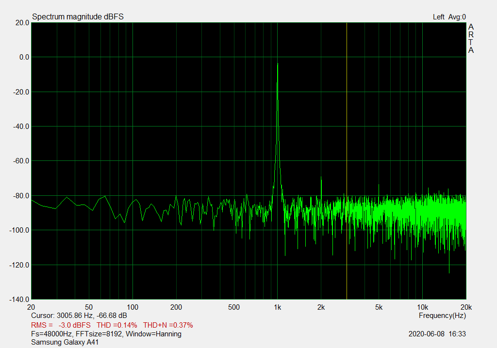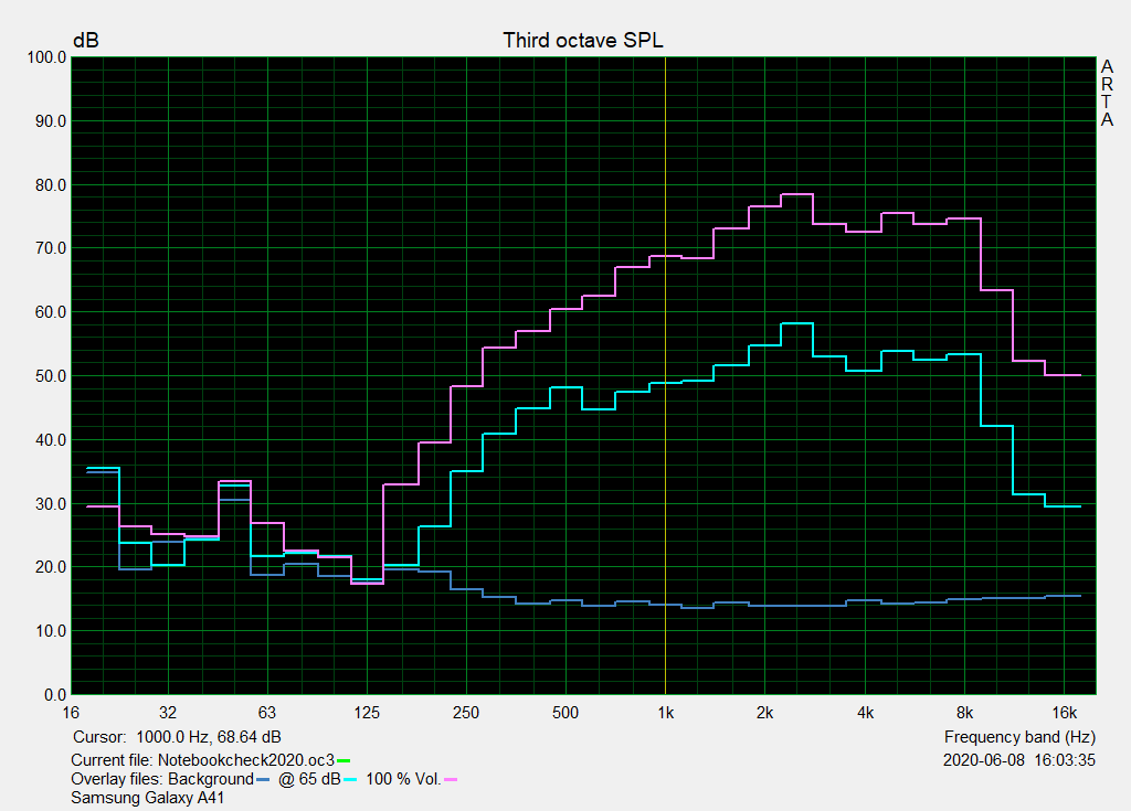 Der Lautsprecher des Galaxy A41 sitzt an der Unterkante neben dem USB-C-Port, kann bis zu 85,5 dB(A) laut spielen und macht seine Sache ordentlich. Auch wenn sich Bässe genauso wenig heraushören lassen wie tiefe Mitten, ist das Klangbild doch recht stimmig und transportiert insbesondere Stimmen sehr gut.