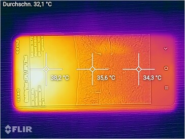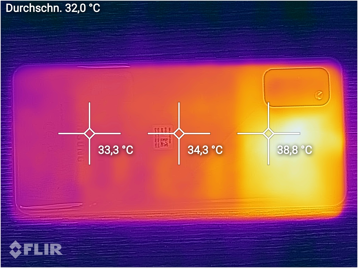 Mit Temperaturen von maximal 37,7 °C bleibt das Galaxy A41 im Betrieb thermisch absolut unauffällig und fühlt sich daher auch nie unangenehm warm an.