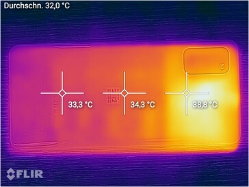 (+) Auf der Unterseite messen wir eine maximalen Wert von 37.7 °C (im Vergleich zum Durchschnitt von 34 °C).