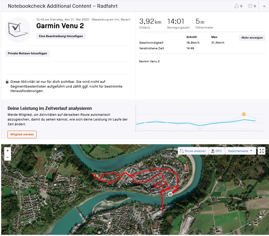 Um eine praxisnahe Einschätzung der Ortungsgenauigkeit geben zu können, fahren wir eine Radrunde mit dem Galaxy A53 und der Garmin Venu 2 als Vergleichsgerät im Gepäck. Tatsächlich zeigt sich das Testhandy an einigen Stellen sogar etwas exakter als die Smartwatch von Garmin, sodass man das Phone getrost für die Navigation verwenden kann.