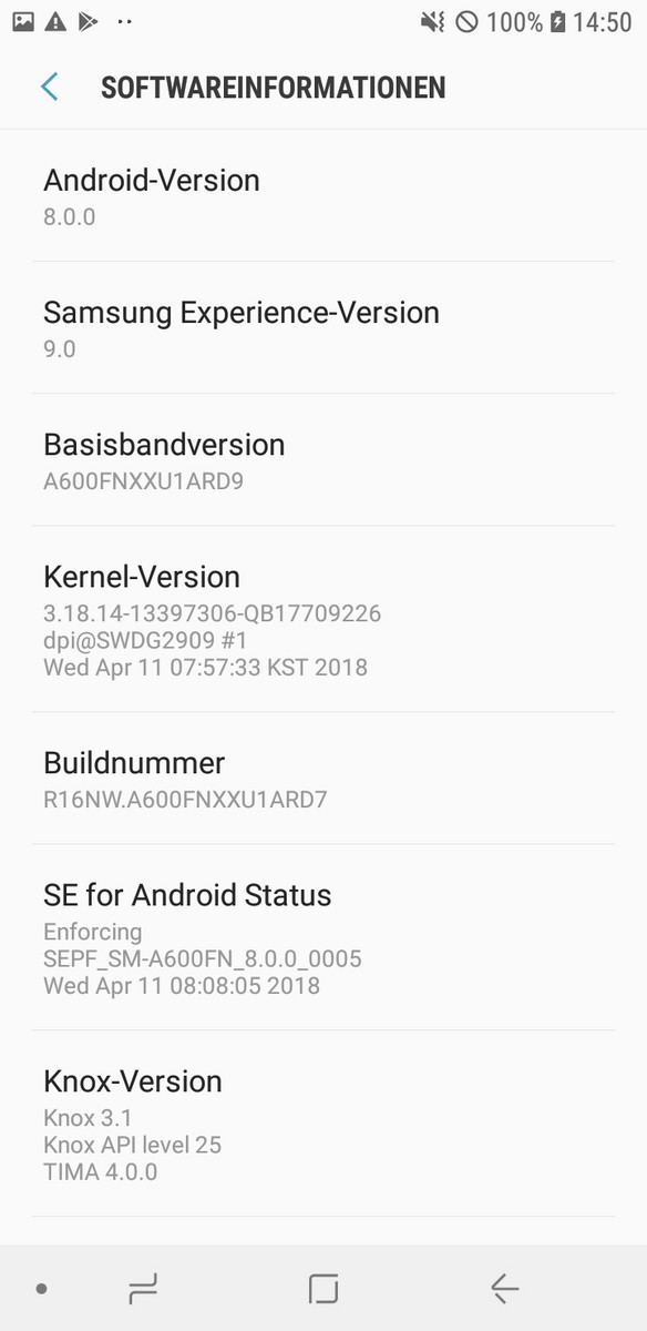 Als Betriebssystem nutzt das Galaxy A6 (2018) Android in der aktuellen Version 8.0. Darüber hat der Hersteller seine Benutzeroberfläche Samsung Experience 9.0 gelegt, die sich zwar in Details, aber nicht grundlegend von einem Stock-Android unterscheidet. Wer nur das Standard-Android kennt, dürfte sich daher schnell mit der Samsung-Variante zurechtfinden. Die Android-Sicherheitspatches waren zum Testzeitpunkt (Ende Juni 2018) auf dem Stand vom 1. April und damit noch relativ aktuell.