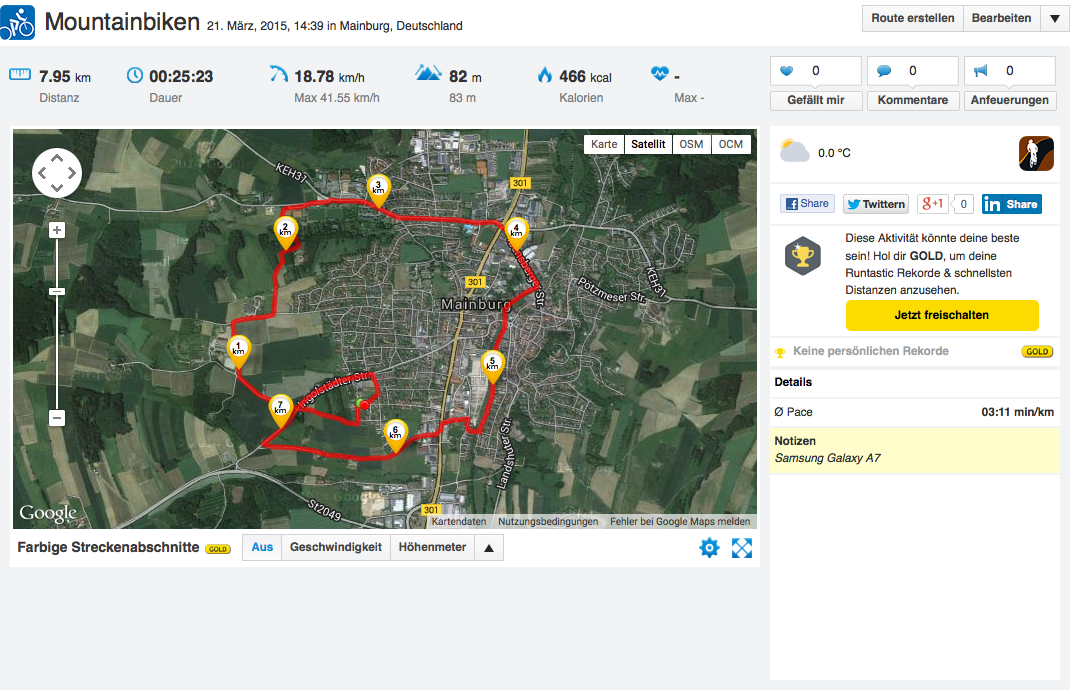 Im Vergleich mit dem Garmin Edge 500, einem Profi-Navi, misst unser Testgerät bei einer Radtour etwa 250 Meter weniger Weg. Das ist nicht verwunderlich, denn das GPS neigt dazu, den Weg abzukürzen und uns statt auf der Straße "fliegend" über Häusern und Bäumen zu platzieren. Dieses Verhalten ist zwar nicht ständig zu beobachten, aber doch vorhanden.