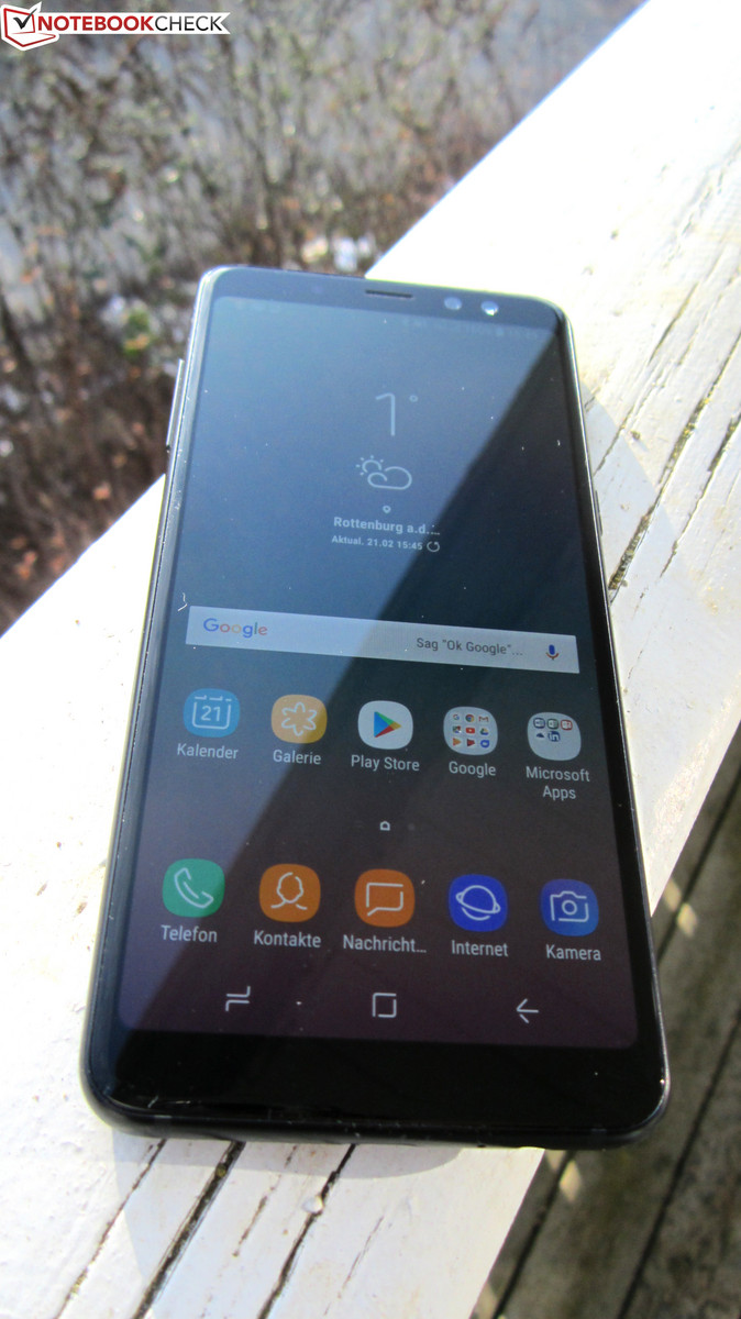 Durch seine hohe Leuchtstärke lässt sich das Display des Galaxy A8 (2018) auch im Freien problemlos ablesen, sofern man direkte Sonneneinstrahlung vermeidet. Auch bei der Blickwinkelstabilität ist alles im grünen Bereich. Erst bei sehr flachen Neigungswinkeln zeigen sich die für OLED-Display charakteristischen Farbschleier, die beim Samsung-Smartphone aber sehr dezent ausfallen und auch nur von einem relativ moderaten Helligkeitsabfall begleitet werden.
