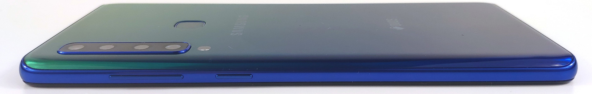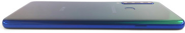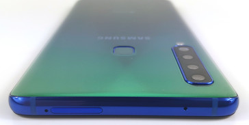 Das Gehäuse überzeugt mit seiner guten Verarbeitungsqualität. Einen spezifizierten Schutz gegen das Eindringen von Staub oder Wasser gibt es für das Galaxy A9 (2018) nicht. Die seitlich gewölbten Ränder der Glasrückseite und die geringe Bauhöhe lassen das Samsung Smartphone sehr gut in der Hand liegen. Bei unserem Testgerät ist jedoch ein kurzer Übergangsbereich zwischen Glas und Rahmen etwas scharfkantig. Die auf der Rückseite positionierte Quad-Kamera steht minimal hervor. Neben dem Kameraelement befindet sich der rückseitig verbaute Fingerabdrucksensor. Dieser sitzt nicht perfekt im Gehäuse und klappert ein weniger bei kraftvoller Benutzung.