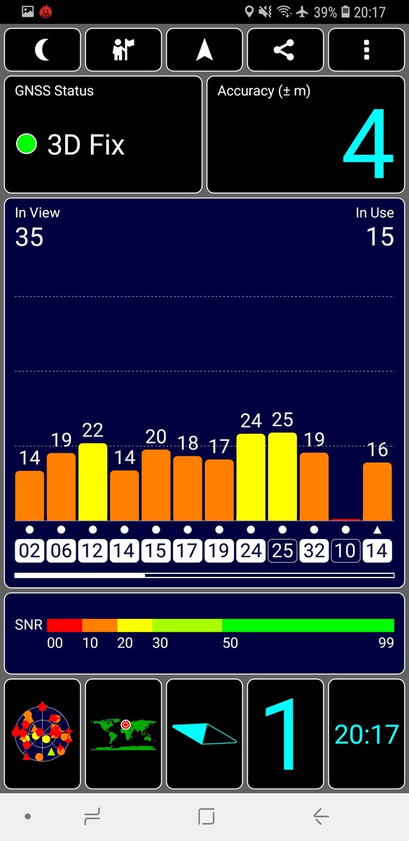 Die Positionsbestimmung erfolgt mittels der Hauptsatellitensysteme GPS, GLONASS, Galileo, Beidou sowie dem satellitenbasierten Ergänzungssystem SBAS. Der Satfix im Freien erfolgt zügig mit einer Genauigkeit von etwa drei Metern. Selbst in Gebäuden gelingt mit dem Galaxy A9 (2018) die Positionsbestimmung recht schnell, aber nur auf vier Meter genau.