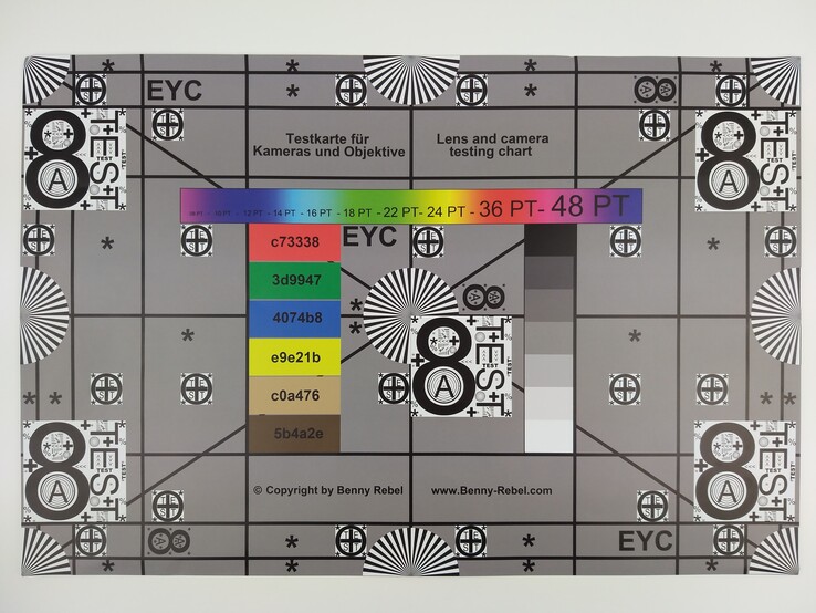 Um die Schärfe der Fotos beurteilen zu können, fotografieren wir unter definiertem Kunstlicht unseren Testchart. Die Bildschärfe in den Aufnahmen ist sehr gut. Auch in den Randbereichen hält sich die Unschärfe in Grenzen.