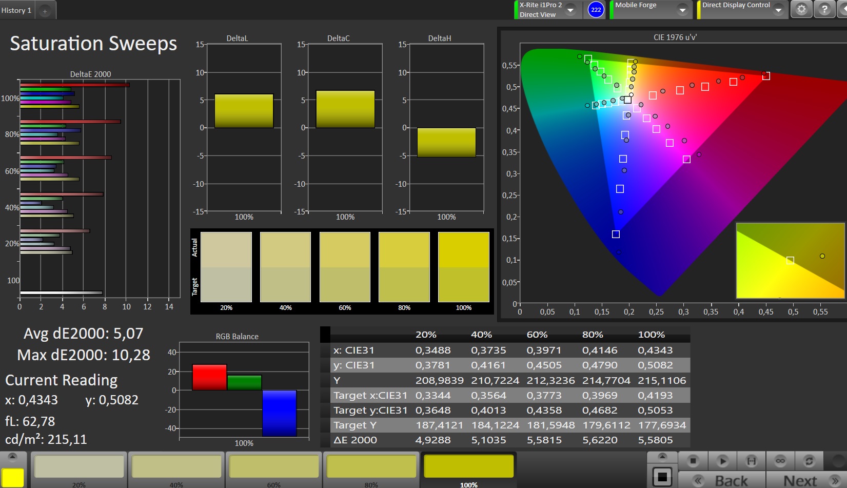 | Colorchecker dE 2000 max. * | 13.05 | 2.4 82% | 10.18 22% | 5.64 57% | 1.4 89% |
