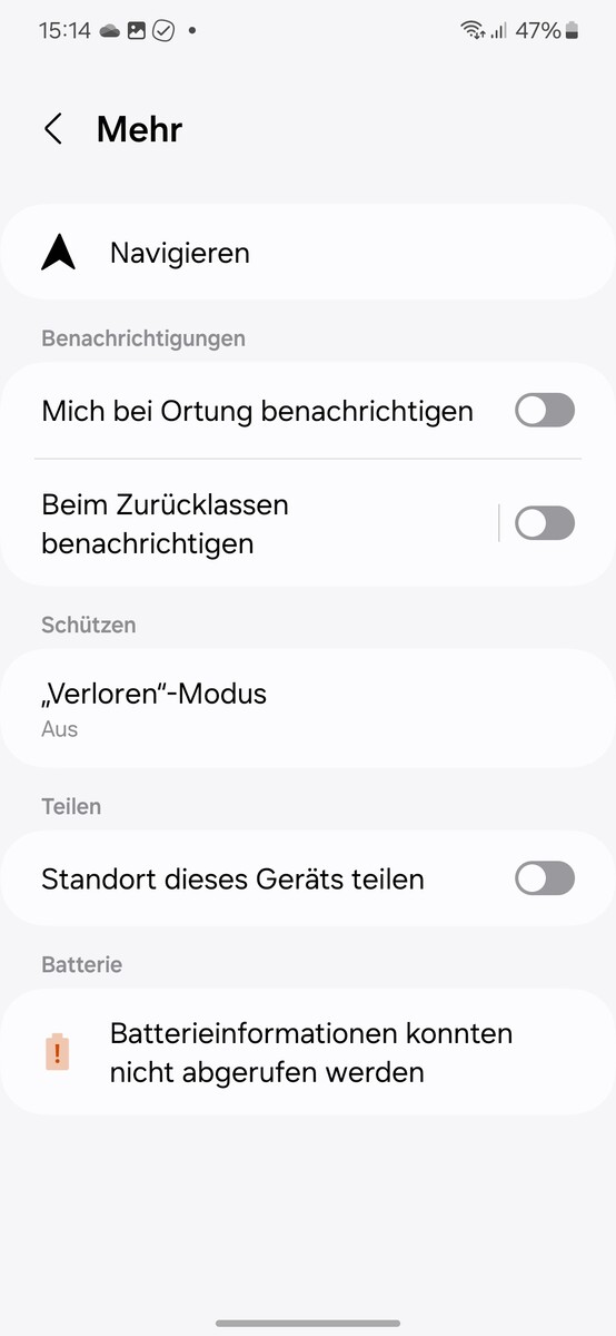 Über die App können nicht nur Firmware-Updates eingespielt werden, sondern lassen sich auch grundlegende Funktionen konfigurieren. Etwa Berührungssteuerung für die Sensorflächen oder die Geräuschkontrollen. Auch die Finden-Funktion ist dort untergebracht. Diese kann verlegte Ohrhörer helfen aufzuspüren, indem sie diese läuten lässt. Mit einem Samsung-Smartphone kann auch SmartThing Find genutzt werden, um die letzte Position der Galaxy Buds FE auf einer Karte anzeigen zu lassen. Das funktioniert für jeden auch für einzelne Ohrhörer, die dann auch aktiv mittels Bluetooth gesucht werden können.