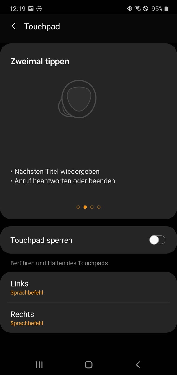 Des Weiteren kann eine Suche der Galaxy Buds über die App angestoßen werden, welche daraufhin immer lauter Piepen. Die Trageerkennung sorgt dafür, dass dies nicht möglich ist, wenn die Kopfhörer genutzt werden. In einem solchen Fall erscheint ein Hinweis auf dem Display des Smartphones.