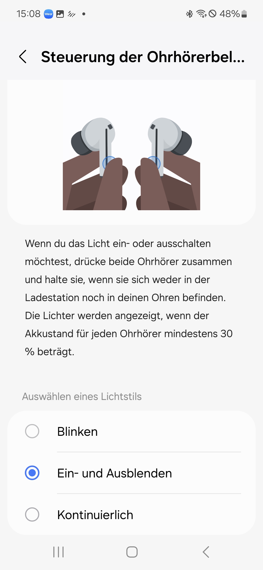 Die Bedienung der Galaxy Buds3 Pro gelingt über jedes gekoppelte Smartphone oder per Touchsteuerung an den Ohrhörern. Letzteres erlaubt die Anruf- und Mediensteuerung, inklusive Lautstärkekontrolle. Außerdem kann auch das Verhalten der LEDs über die App konfiguriert werden.