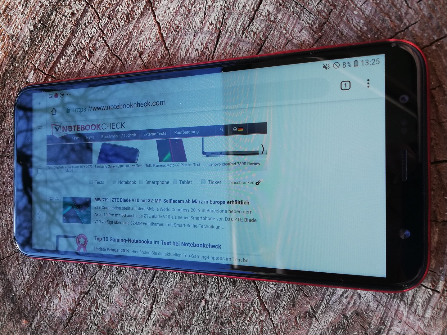 Der Bildschirm des Samsung Galaxy J6 Plus besteht aus einem 6 Zoll großen TFT-Panel im Format 18,5:9 und bietet eine Auflösung von 1.480 x 720 Bildpunkten. Die durchschnittliche Helligkeit liegt dabei mit circa 508 cd/m² im Mittelfeld der von uns gewählten Vergleichsgeräte. Ohne Sensor liegt die maximale Leuchtkraft bei 446 cd/m² und im APL50-Test werden 515 cd/m² erreicht. Mit einem Wert von 95 Prozent bietet das J6+ zudem die beste Ausleuchtung in unserem Testfeld.