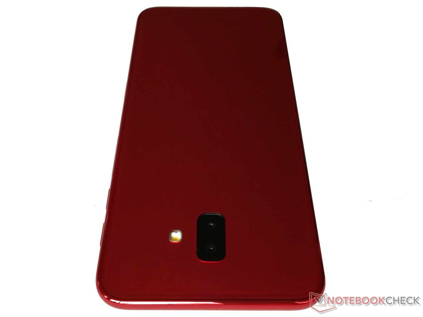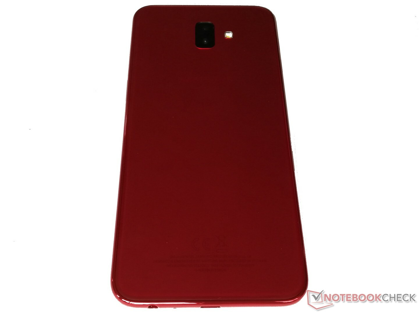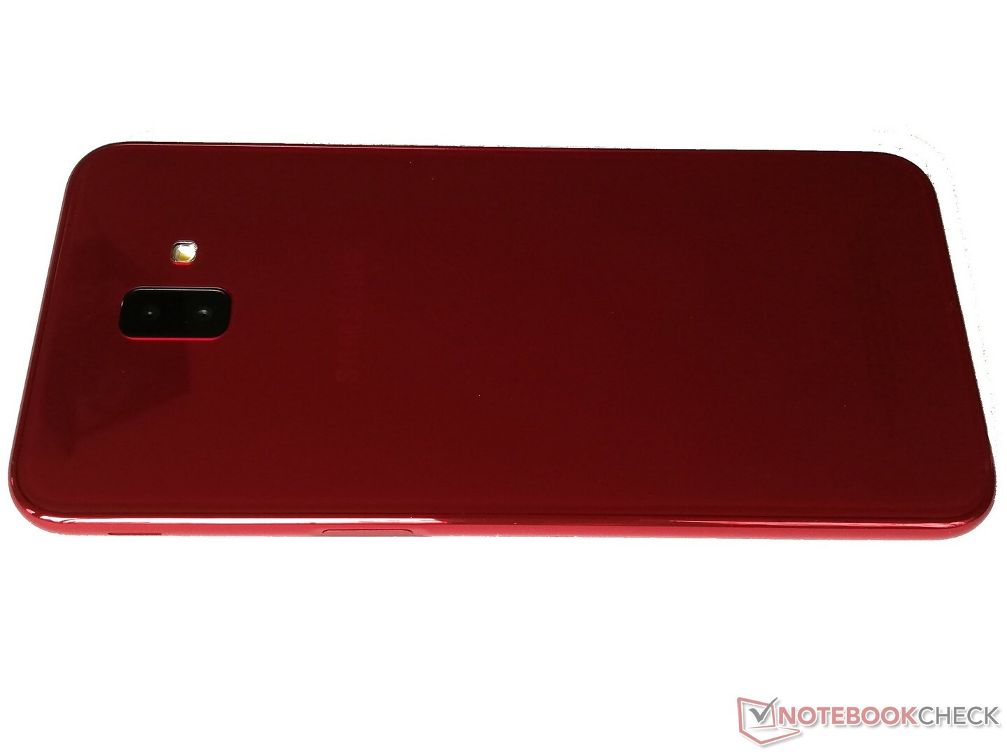 Das Galaxy J6 Plus ist in den Farben Rot, Grau und Schwarz erhältlich, die den Rahmen aus Metall sowie die Rückseite aus Glas vollständig einnehmen. Letztere beherbergt nur noch die Dual-Kamera und den LED-Blitz, da der Fingerabdrucksensor in den Power-Knopf auf der rechten Geräteseite gewandert ist. Auf der Vorderseite verzichtet Samsung auf den Einsatz einer Notch, wodurch sich über und unter dem Display ein schwarzer Rahmen befindet.