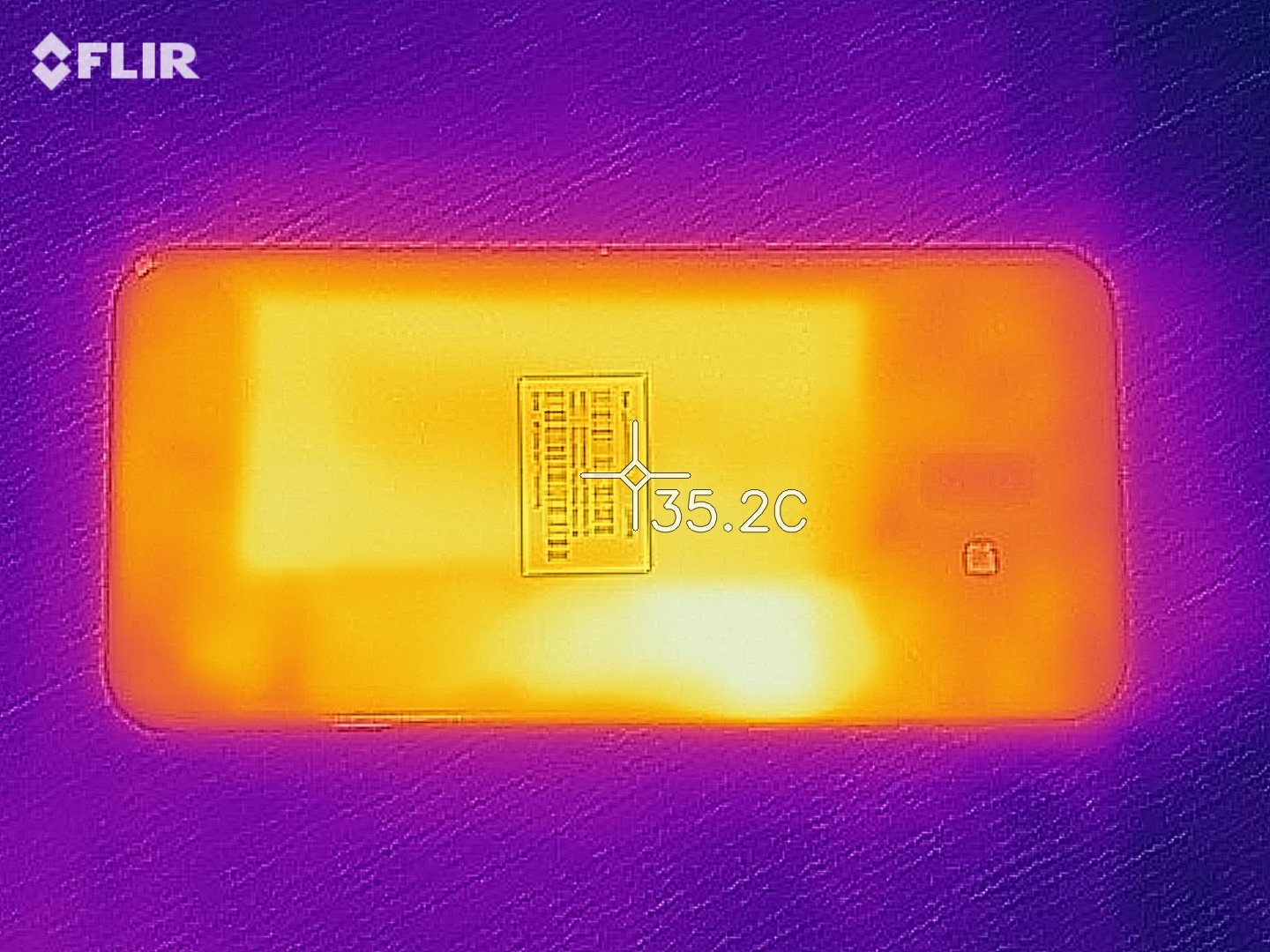 (+) Auf der Unterseite messen wir eine maximalen Wert von 33.4 °C (im Vergleich zum Durchschnitt von 34 °C).