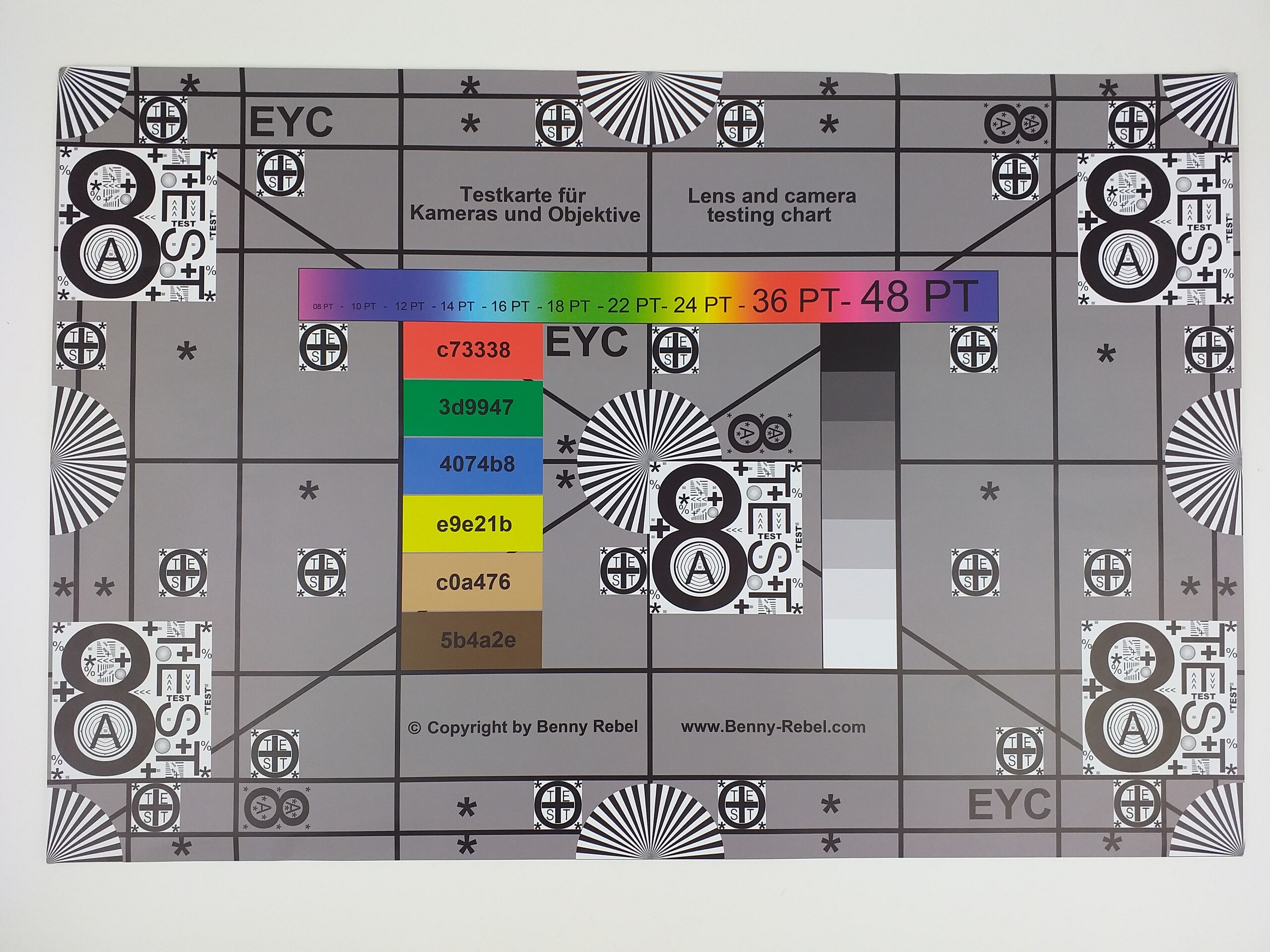 Unter kontrollierten Lichtbedingungen wird unser Testchart gut abgebildet. Details und feine Strukturen sind dabei sehr gut zu erkennen, Farben wirken aber auch hier zu hell. Außerdem stellt sich in den unteren Ecken eine deutlich sichtbare Blässe ein.